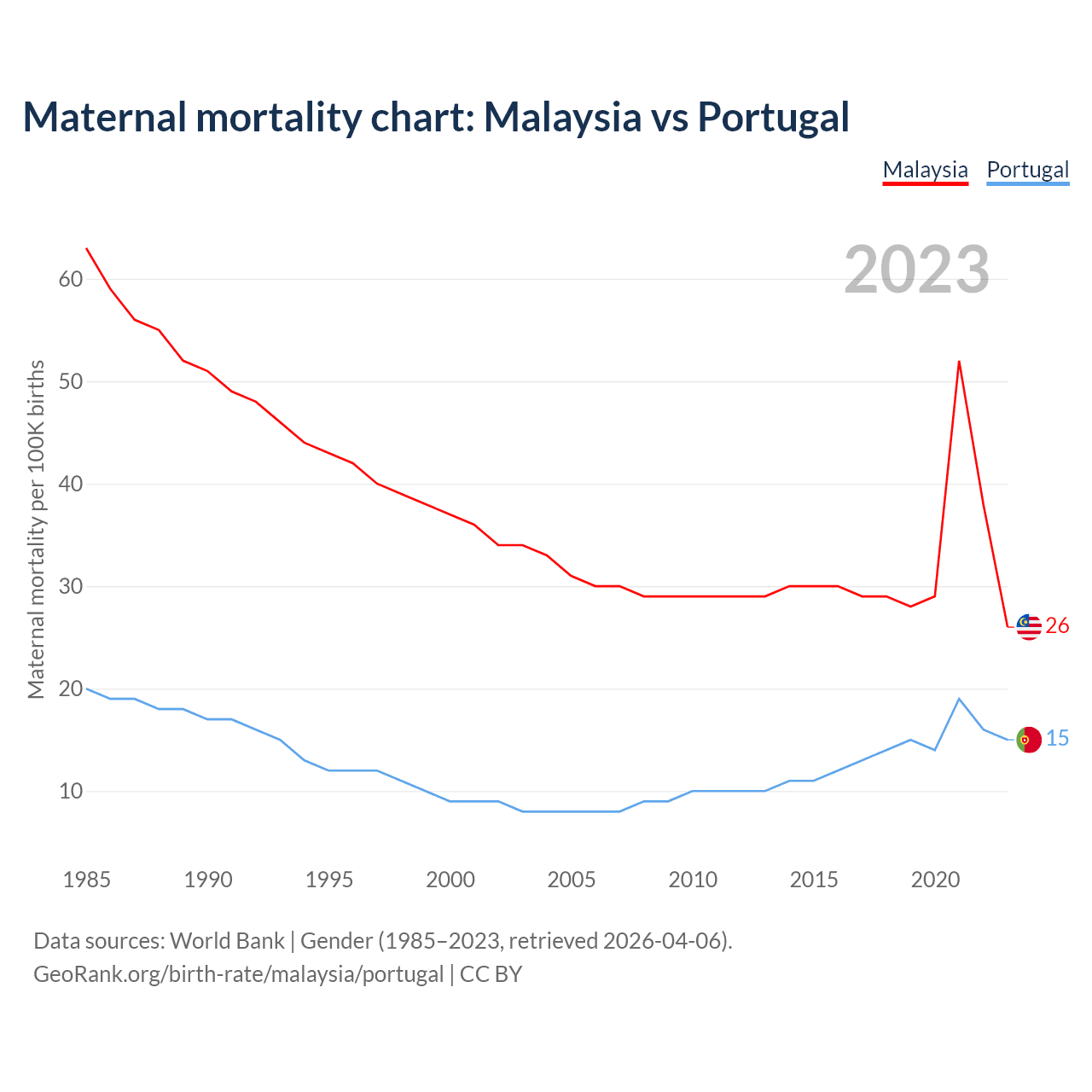 The maternal mortality rate, which is the probability of dying during childbirth or within 42 days of pregnancy termination, is 26 deaths per 100,000 live births in Malaysia, compared to 15 deaths in Portugal.
