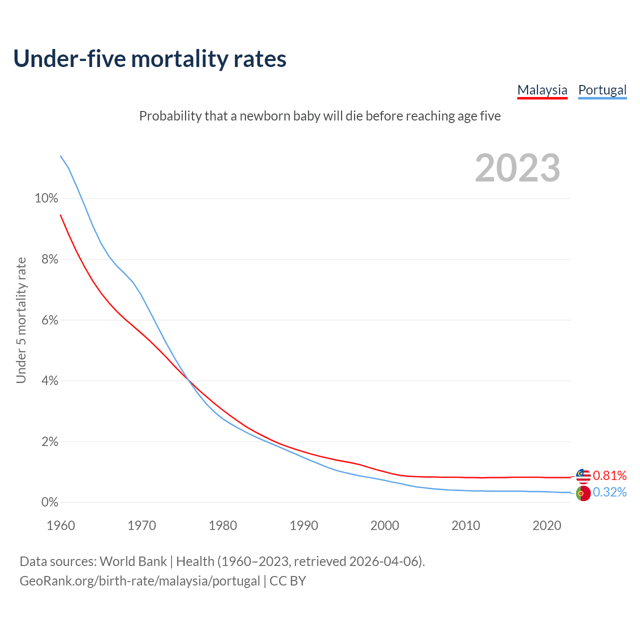 The chance that a newborn baby will die before reaching age five is 0.81% in Malaysia and 0.32% in Portugal. Above is a chart with historical data on under-five mortality rates.