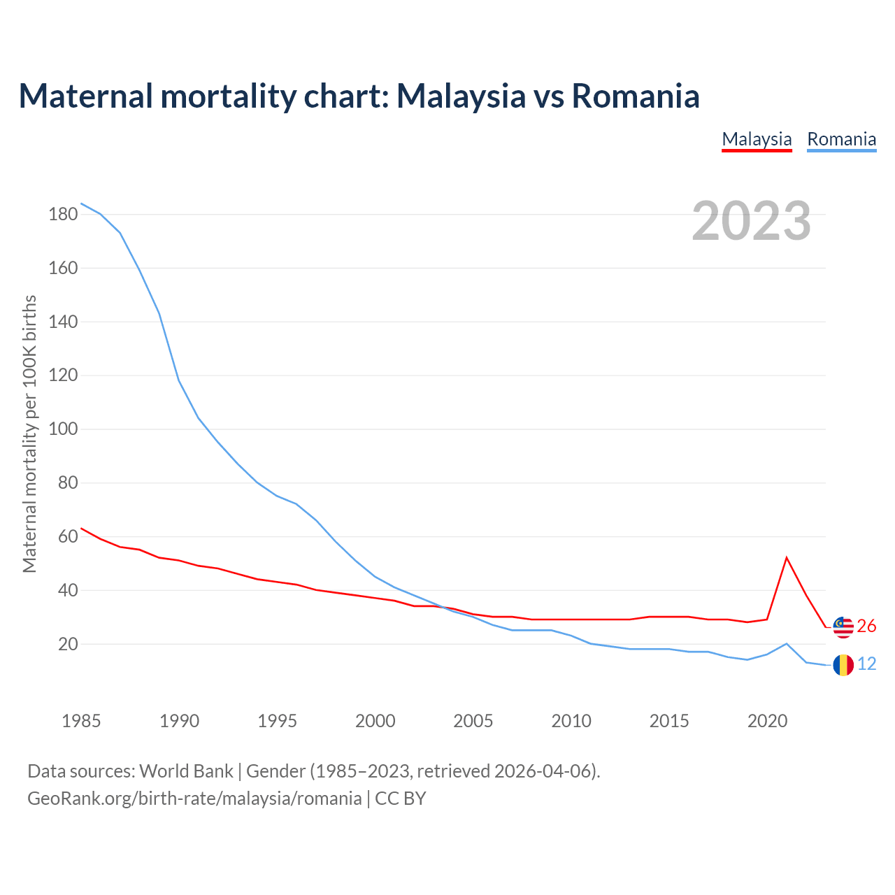 The maternal mortality rate, which is the probability of dying during childbirth or within 42 days of pregnancy termination, is 26 deaths per 100,000 live births in Malaysia, compared to 12 deaths in Romania.