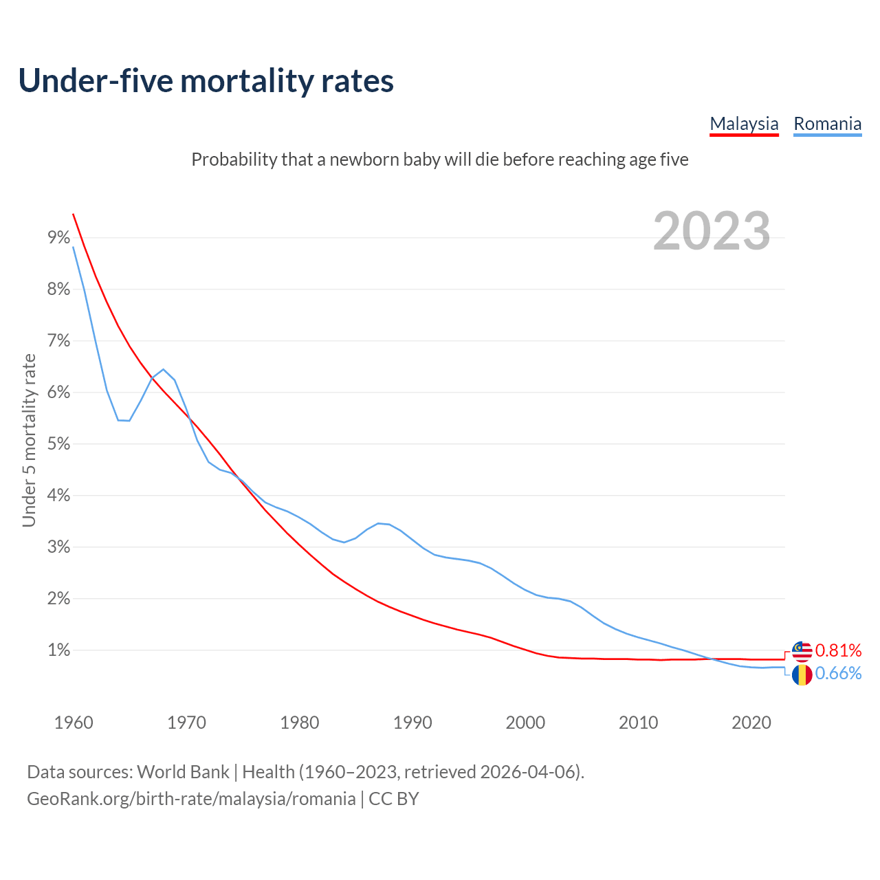 The chance that a newborn baby will die before reaching age five is 0.81% in Malaysia and 0.66% in Romania. Above is a chart with historical data on under-five mortality rates.