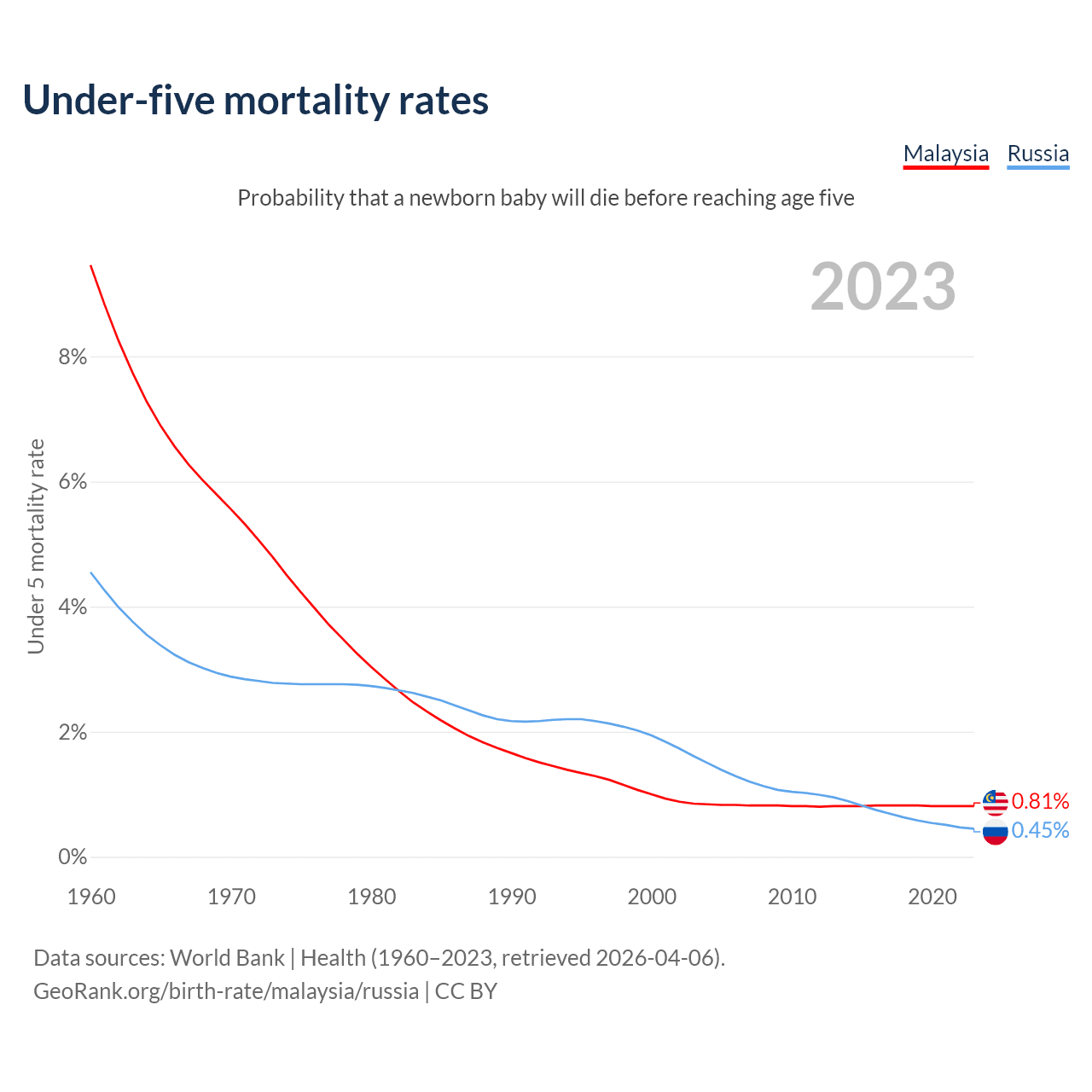 The chance that a newborn baby will die before reaching age five is 0.81% in Malaysia and 0.45% in Russia. Above is a chart with historical data on under-five mortality rates.