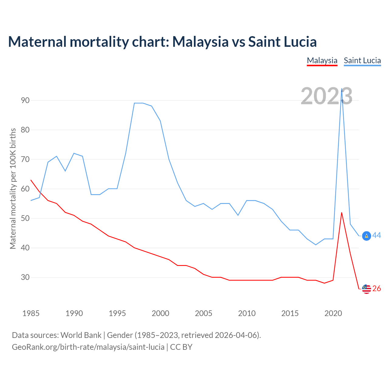 The maternal mortality rate, which is the probability of dying during childbirth or within 42 days of pregnancy termination, is 26 deaths per 100,000 live births in Malaysia, compared to 44 deaths in Saint Lucia.
