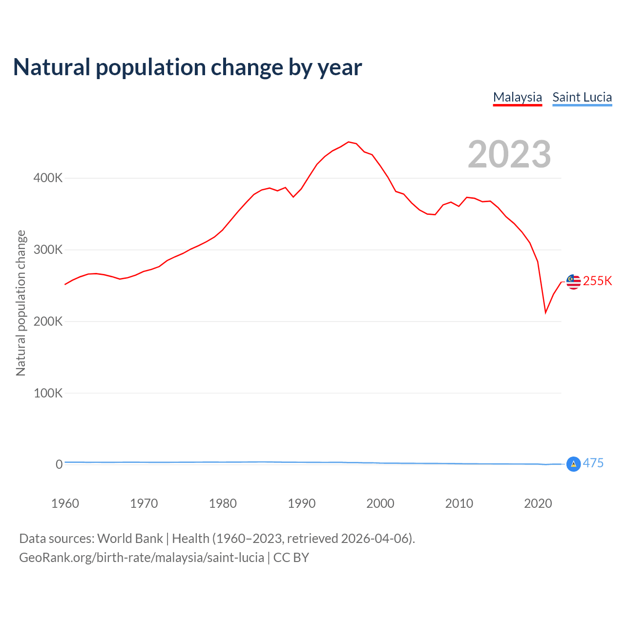 Malaysia has an annual birth rate of 12.4 births per 1,000 people, compared to 11.3 for Saint Lucia. The average number of children a woman is expected to have during her lifetime — the fertility rate, is 1.55 in Malaysia and 1.38 in Saint Lucia — 11% difference.