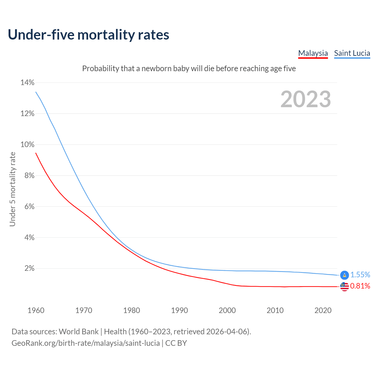 The chance that a newborn baby will die before reaching age five is 0.81% in Malaysia and 1.55% in Saint Lucia. Above is a chart with historical data on under-five mortality rates.