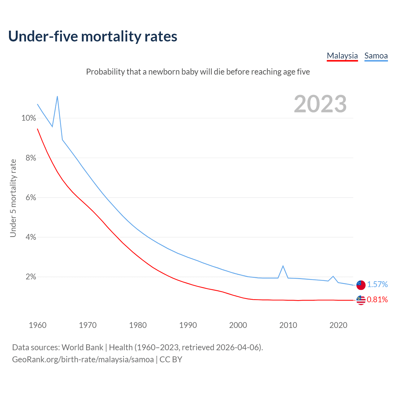 The chance that a newborn baby will die before reaching age five is 0.81% in Malaysia and 1.57% in Samoa. Above is a chart with historical data on under-five mortality rates.
