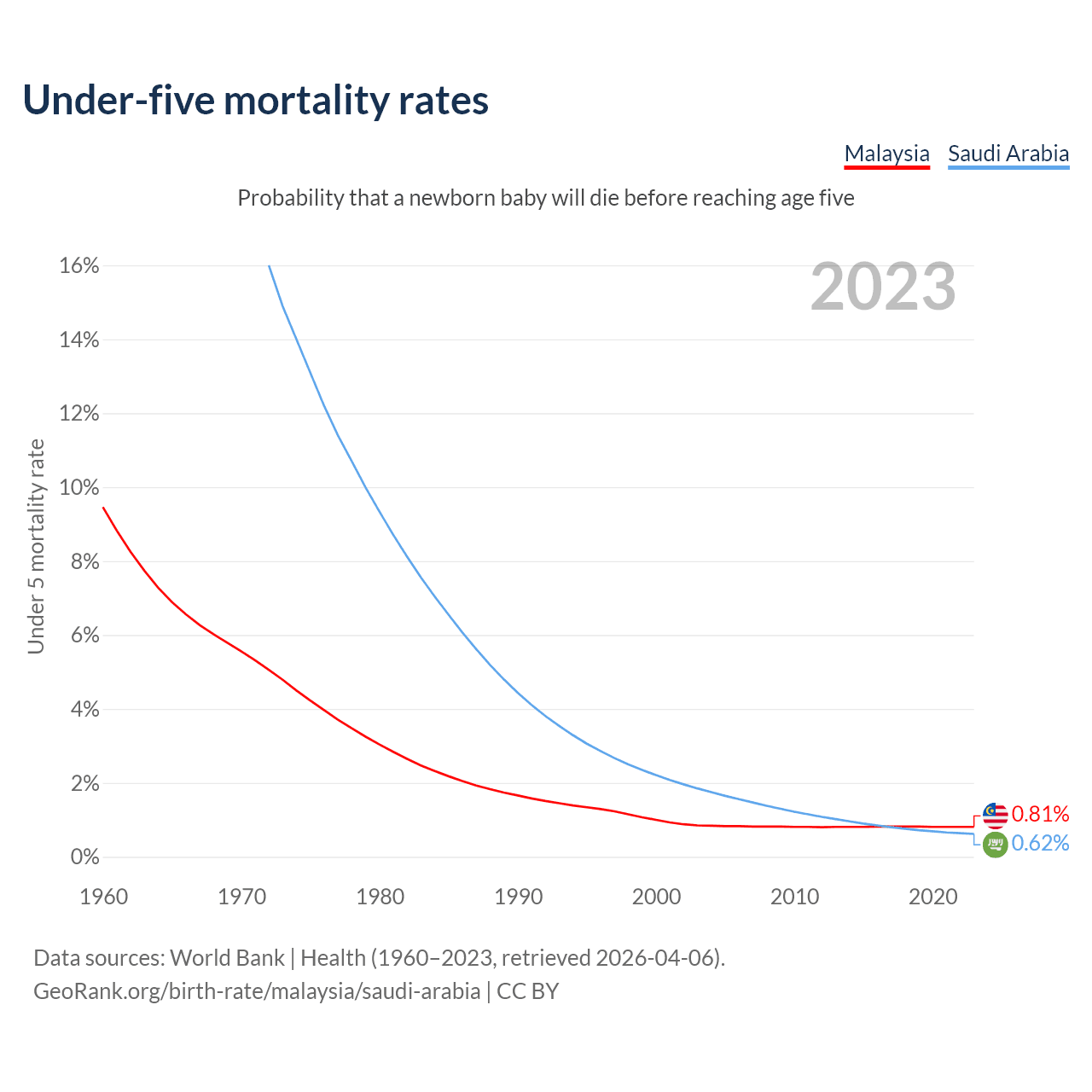 The chance that a newborn baby will die before reaching age five is 0.81% in Malaysia and 0.62% in Saudi Arabia. Above is a chart with historical data on under-five mortality rates.