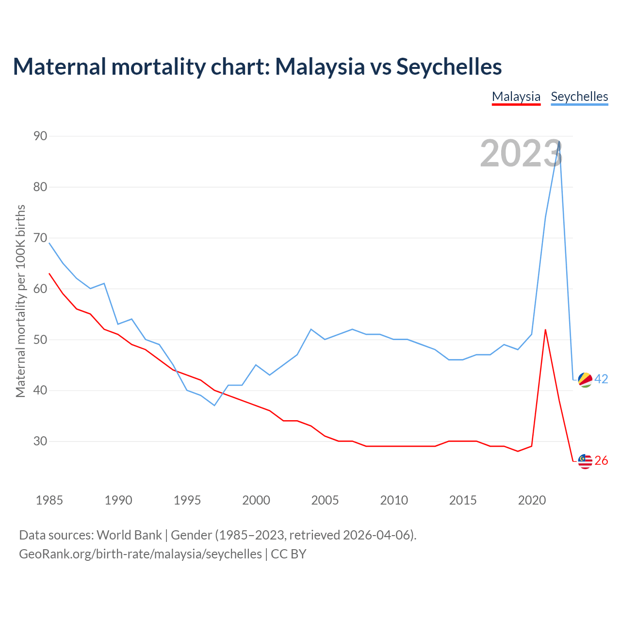 The maternal mortality rate, which is the probability of dying during childbirth or within 42 days of pregnancy termination, is 26 deaths per 100,000 live births in Malaysia, compared to 42 deaths in the Seychelles.