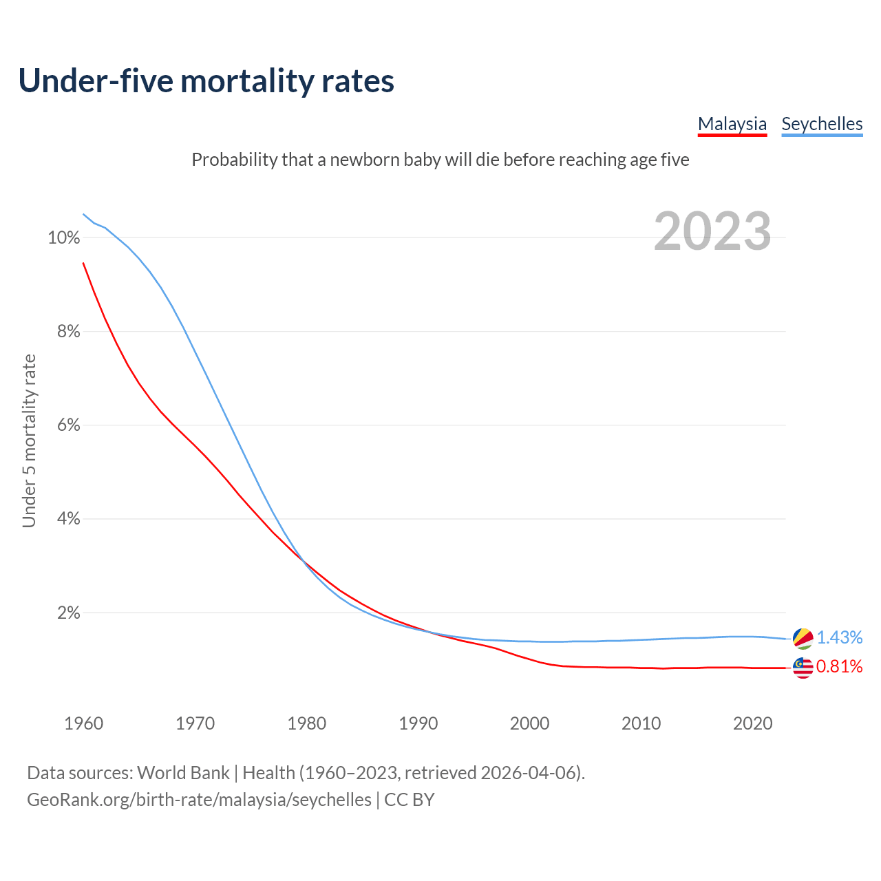 The chance that a newborn baby will die before reaching age five is 0.81% in Malaysia and 1.43% in the Seychelles. Above is a chart with historical data on under-five mortality rates.