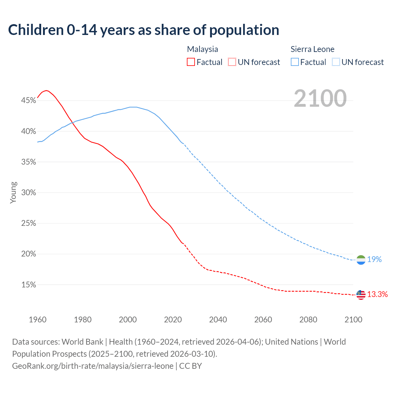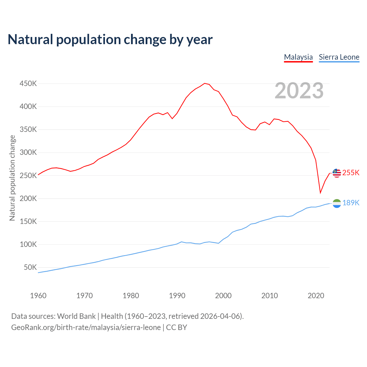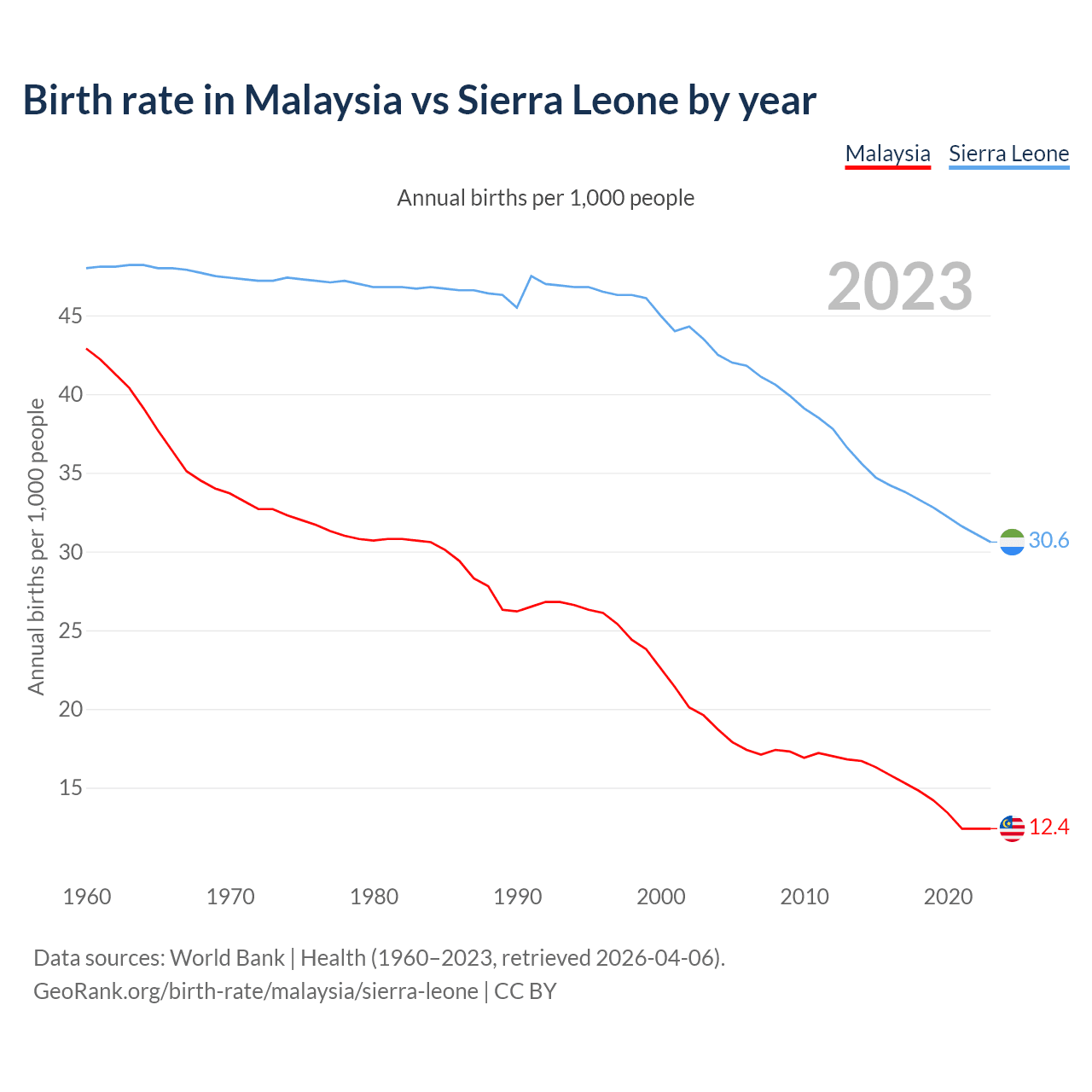 Malaysia has an annual birth rate of 12.4 births per 1,000 people, compared to 30.6 for Sierra Leone. The average number of children a woman is expected to have during her lifetime — the fertility rate, is 1.55 in Malaysia and 3.79 in Sierra Leone — 144.6% difference.