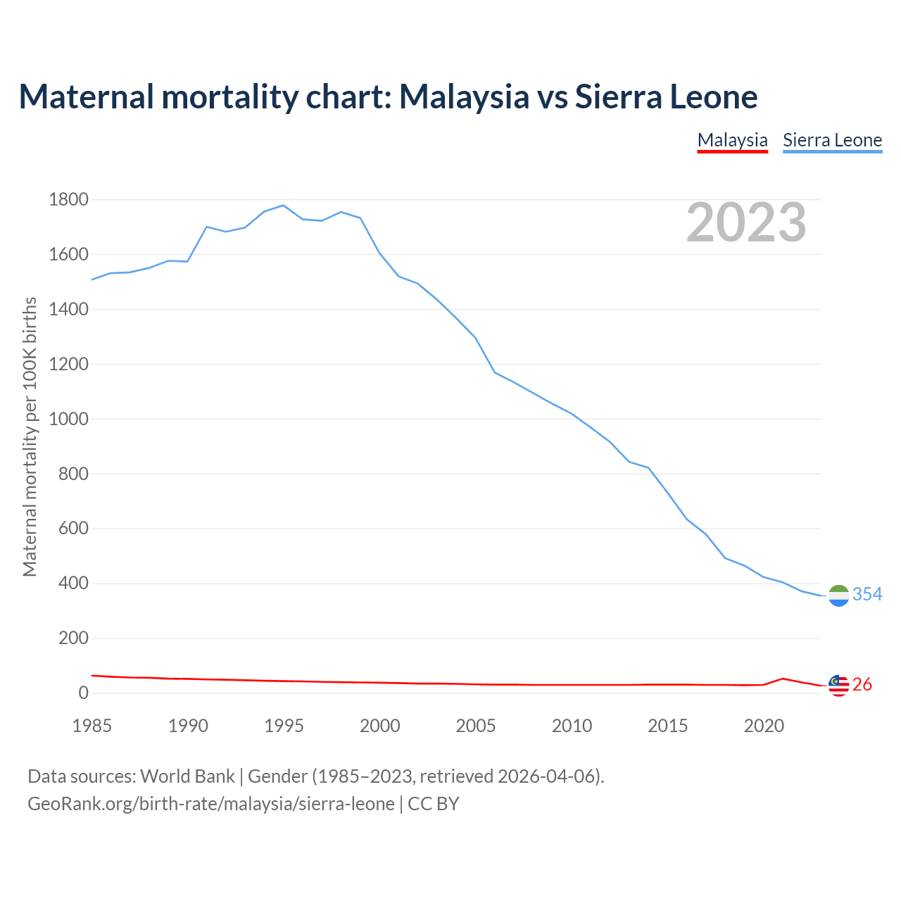 The maternal mortality rate, which is the probability of dying during childbirth or within 42 days of pregnancy termination, is 26 deaths per 100,000 live births in Malaysia, compared to 354 deaths in Sierra Leone.