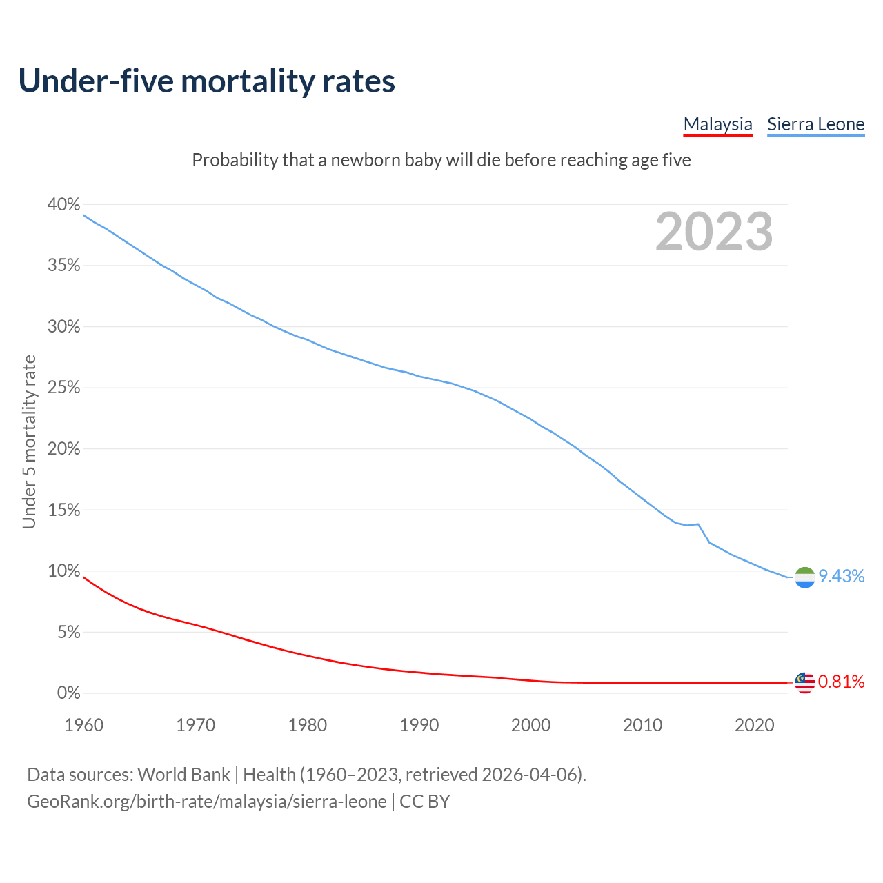 The chance that a newborn baby will die before reaching age five is 0.81% in Malaysia and 9.43% in Sierra Leone. Above is a chart with historical data on under-five mortality rates.