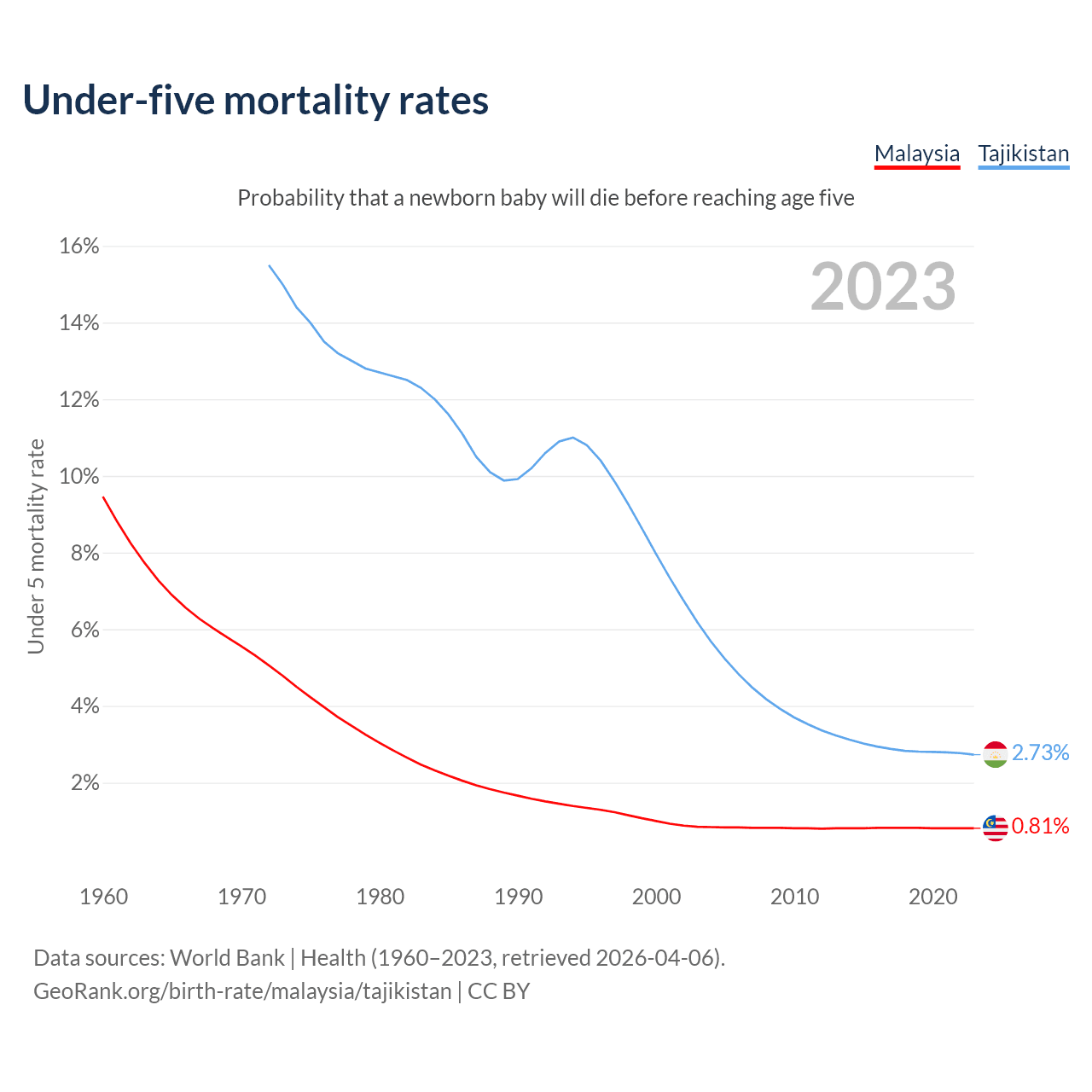 The chance that a newborn baby will die before reaching age five is 0.81% in Malaysia and 2.73% in Tajikistan. Above is a chart with historical data on under-five mortality rates.