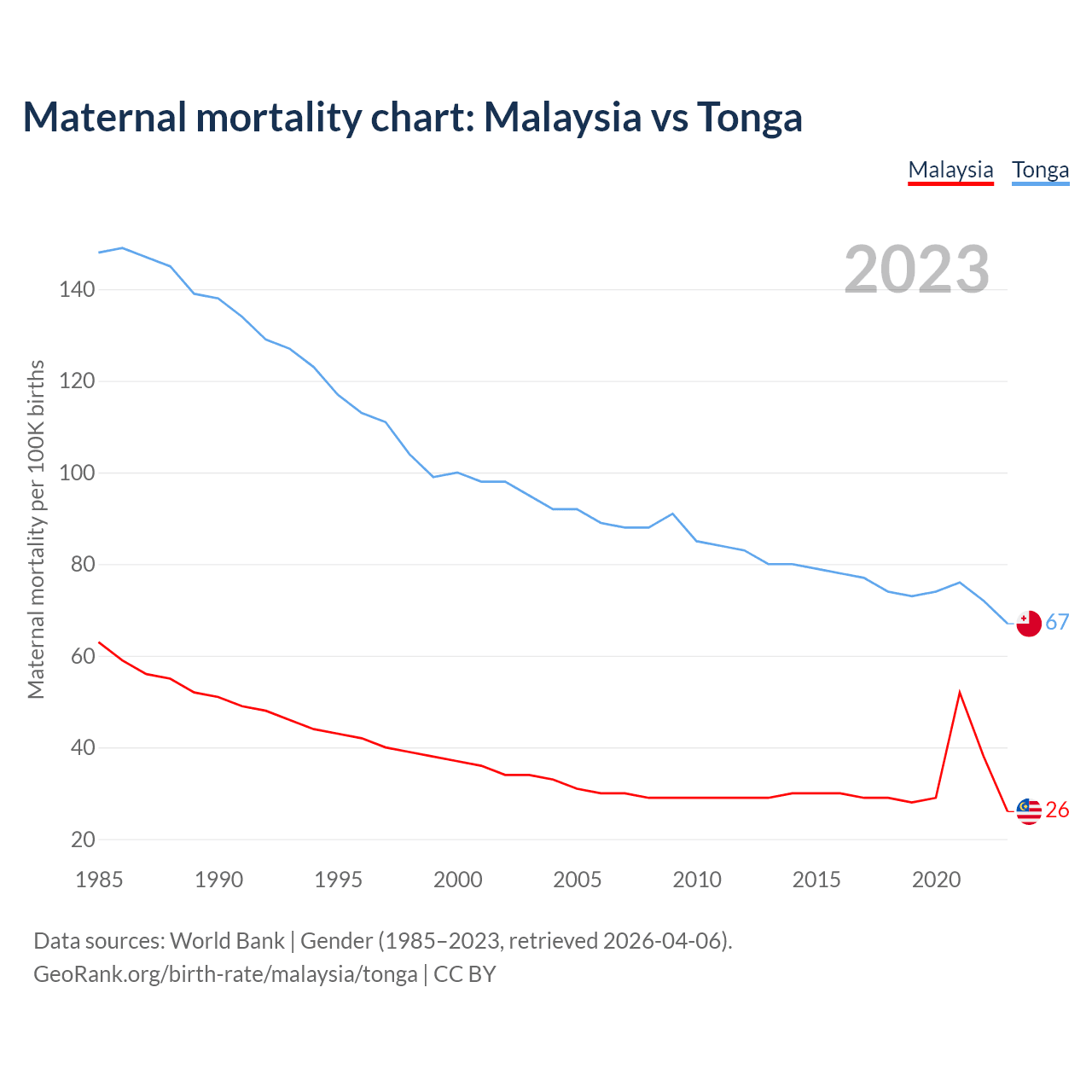 The maternal mortality rate, which is the probability of dying during childbirth or within 42 days of pregnancy termination, is 26 deaths per 100,000 live births in Malaysia, compared to 67 deaths in Tonga.