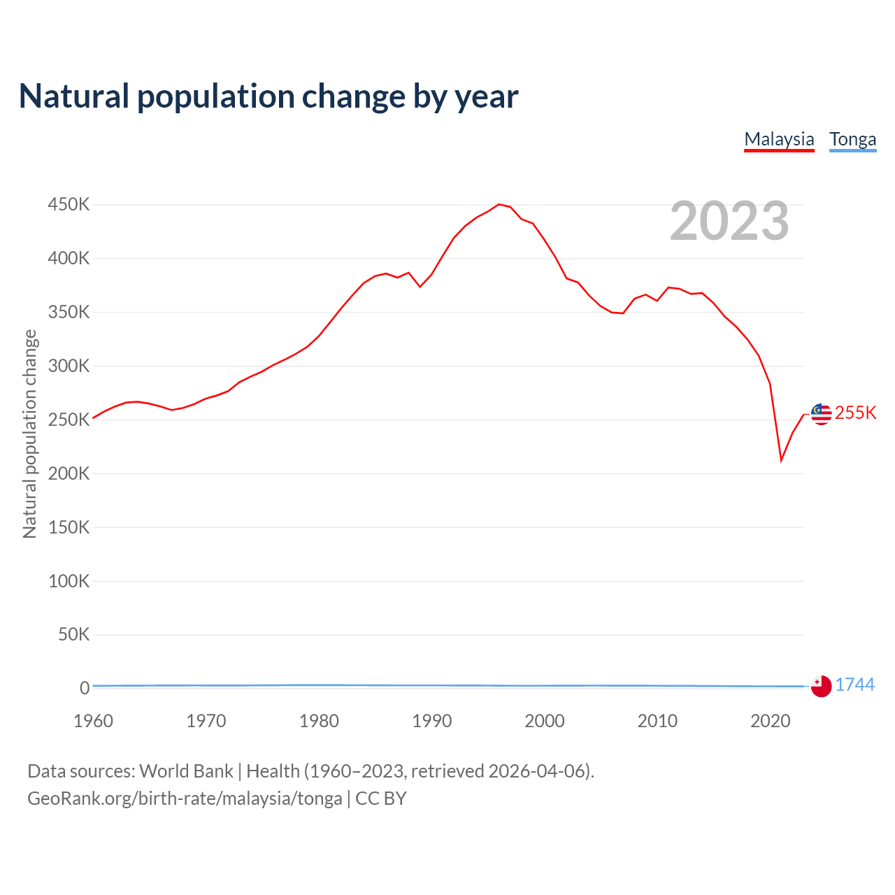 Malaysia has an annual birth rate of 12.4 births per 1,000 people, compared to 23.1 for Tonga. The average number of children a woman is expected to have during her lifetime — the fertility rate, is 1.55 in Malaysia and 3.13 in Tonga — 101.9% difference.