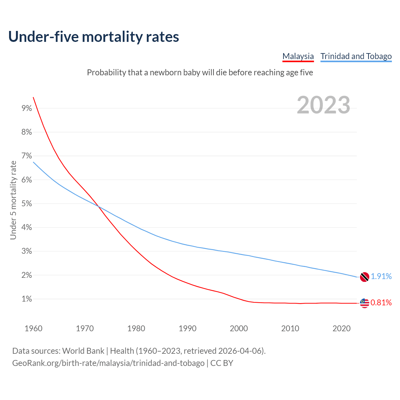 The chance that a newborn baby will die before reaching age five is 0.81% in Malaysia and 1.91% in Trinidad and Tobago. Above is a chart with historical data on under-five mortality rates.