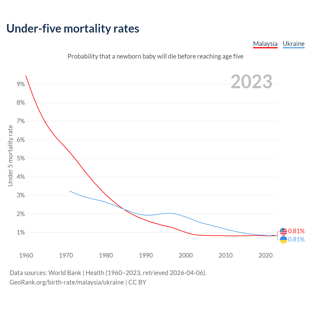 The chance that a newborn baby will die before reaching age five is 0.81% in Malaysia and 0.81% in Ukraine. Above is a chart with historical data on under-five mortality rates.