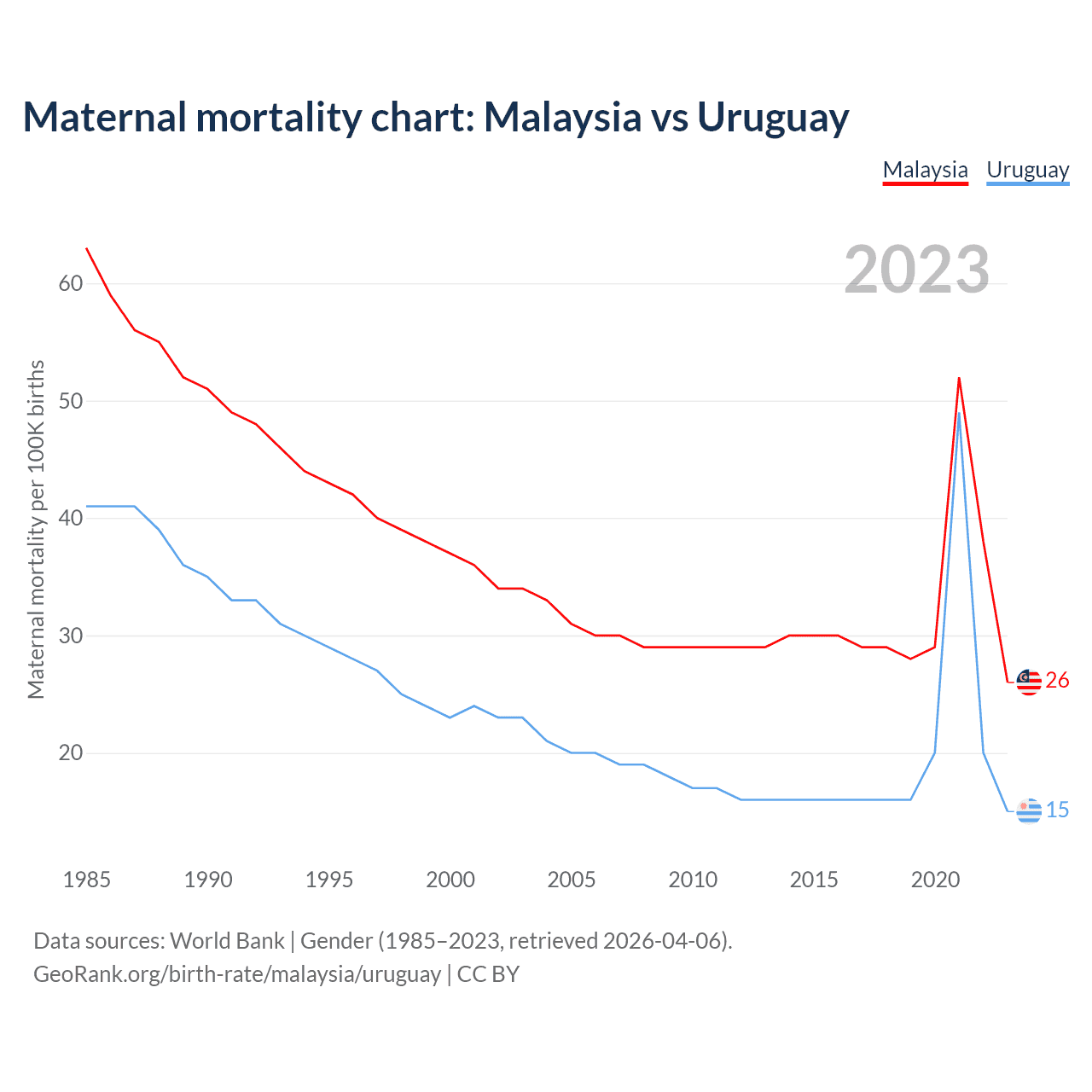 The maternal mortality rate, which is the probability of dying during childbirth or within 42 days of pregnancy termination, is 26 deaths per 100,000 live births in Malaysia, compared to 15 deaths in Uruguay.