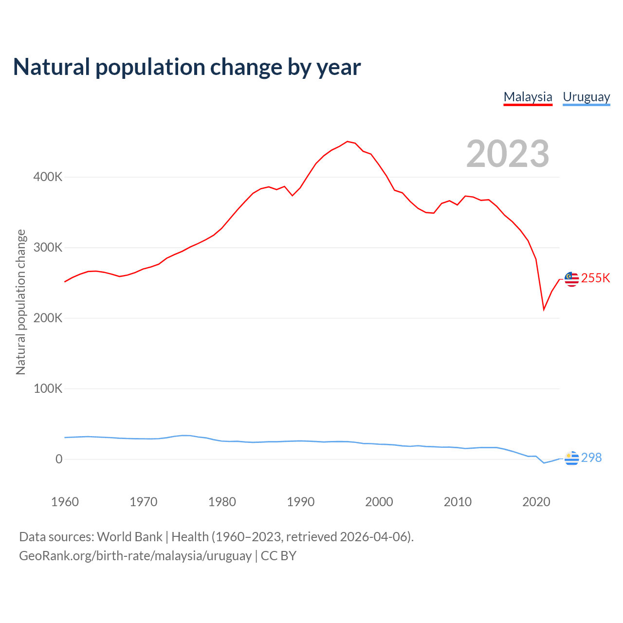 Malaysia has an annual birth rate of 12.4 births per 1,000 people, compared to 9.87 for Uruguay. The average number of children a woman is expected to have during her lifetime — the fertility rate, is 1.55 in Malaysia and 1.41 in Uruguay — 9.1% difference.