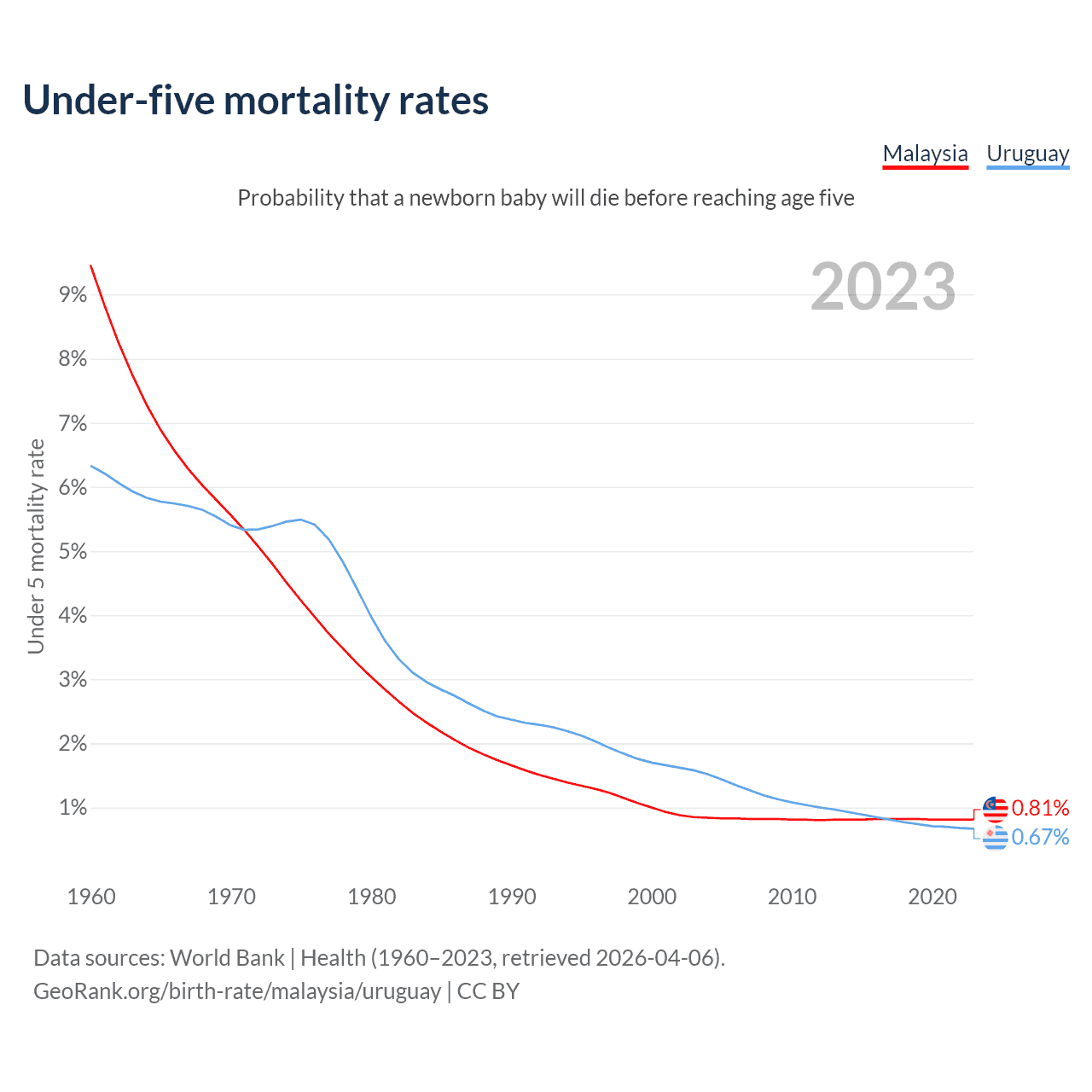 The chance that a newborn baby will die before reaching age five is 0.81% in Malaysia and 0.67% in Uruguay. Above is a chart with historical data on under-five mortality rates.