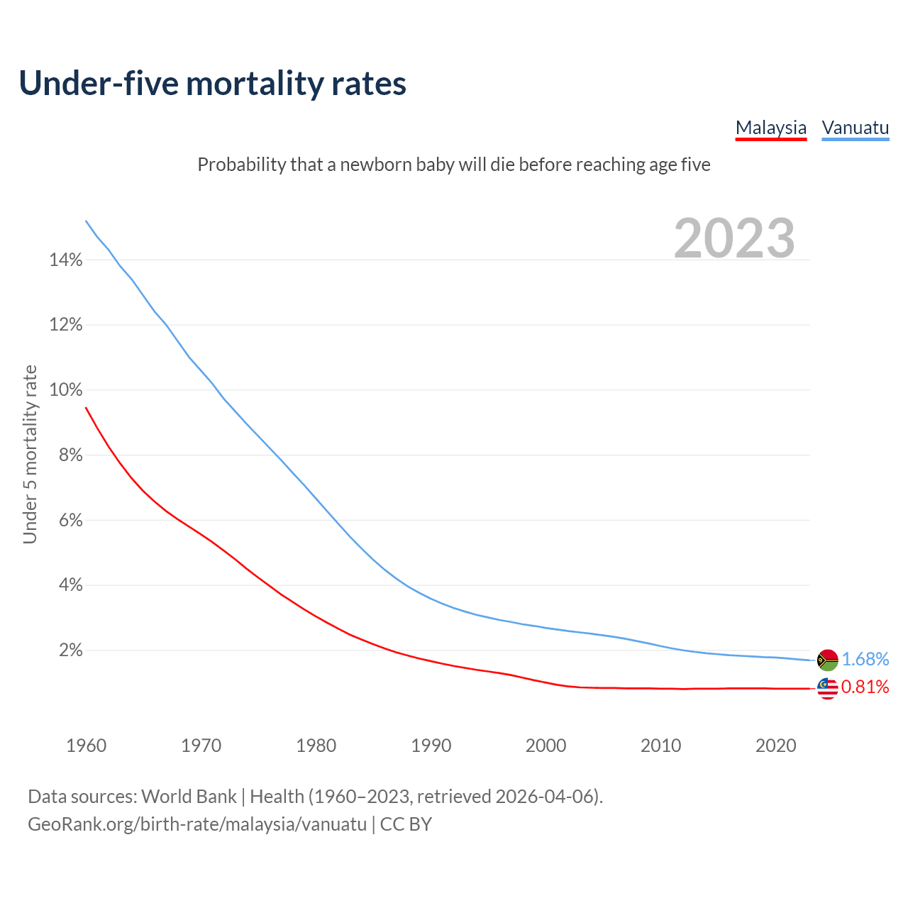 The chance that a newborn baby will die before reaching age five is 0.81% in Malaysia and 1.68% in Vanuatu. Above is a chart with historical data on under-five mortality rates.