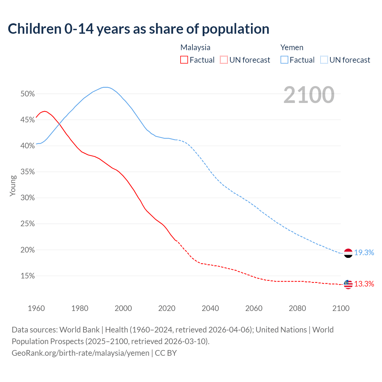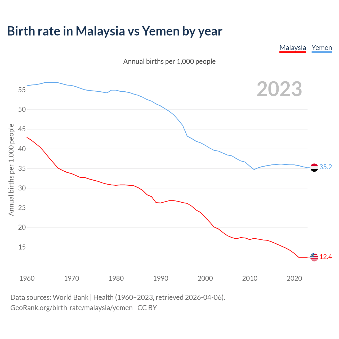 Malaysia has an annual birth rate of 12.4 births per 1,000 people, compared to 35.2 for Yemen. The average number of children a woman is expected to have during her lifetime — the fertility rate, is 1.55 in Malaysia and 4.59 in Yemen — 196.1% difference.