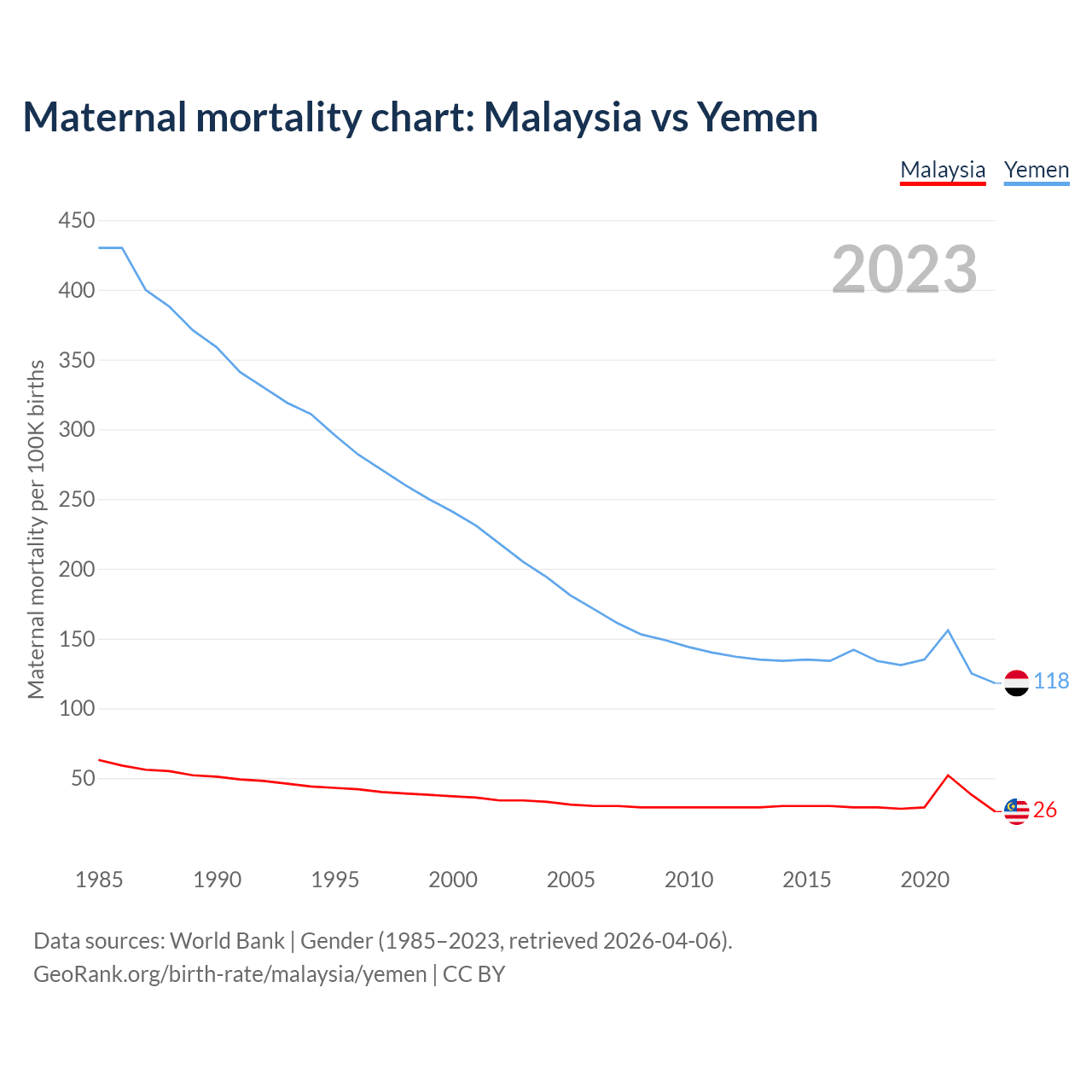 The maternal mortality rate, which is the probability of dying during childbirth or within 42 days of pregnancy termination, is 26 deaths per 100,000 live births in Malaysia, compared to 118 deaths in Yemen.