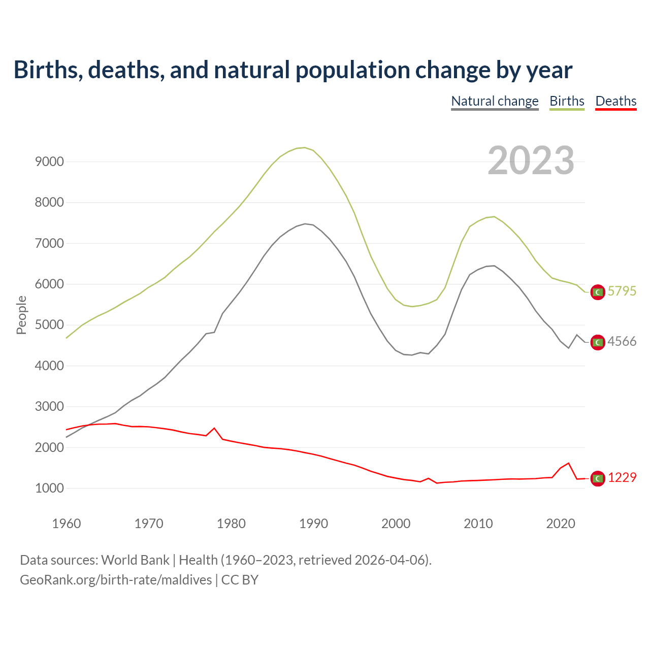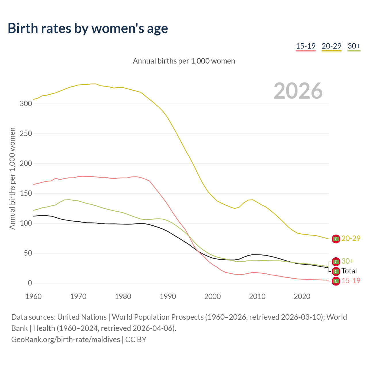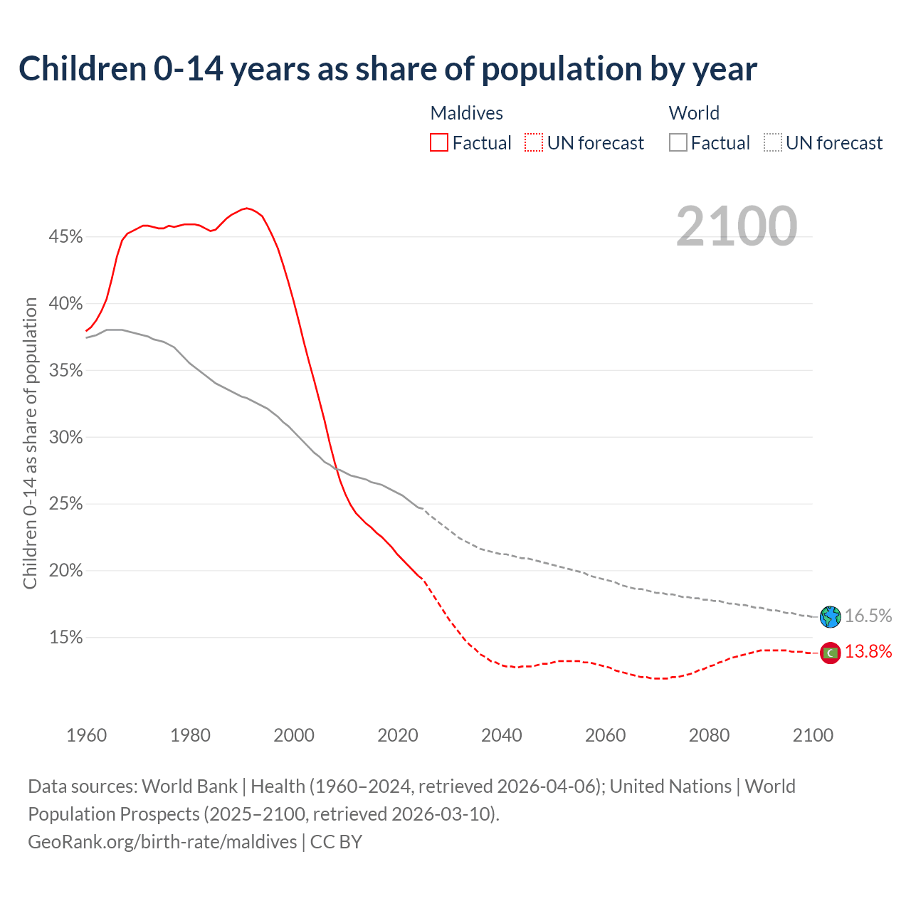 According to the latest birth rate data available, the fertility rate in Maldives was 1.58 in 2023 and has been below the replacement level of 2.1 children per woman since 2014. In 1993, the fertility rate was 5.06 — a 68.9% decline in 30 years.