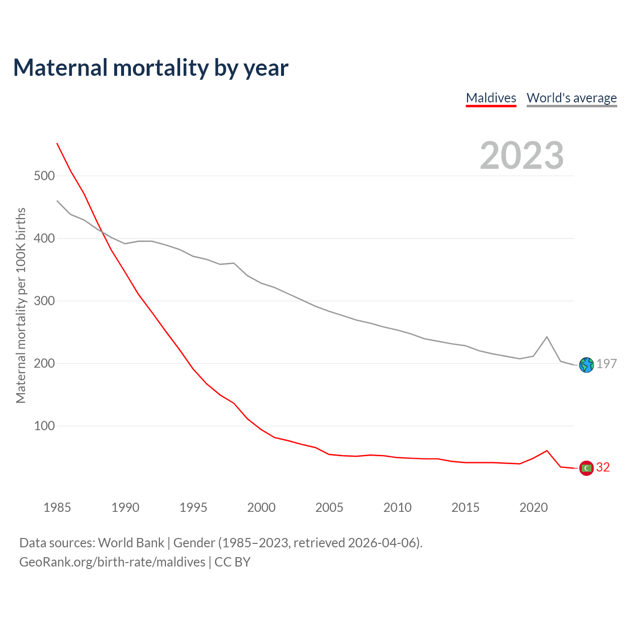 The maternal mortality rate in Maldives was 32 deaths per 100,000 live births in 2023 — a 0.03% chance of dying during childbirth or within 42 days of pregnancy termination. This is a 66% decrease compared to the year 2000.
