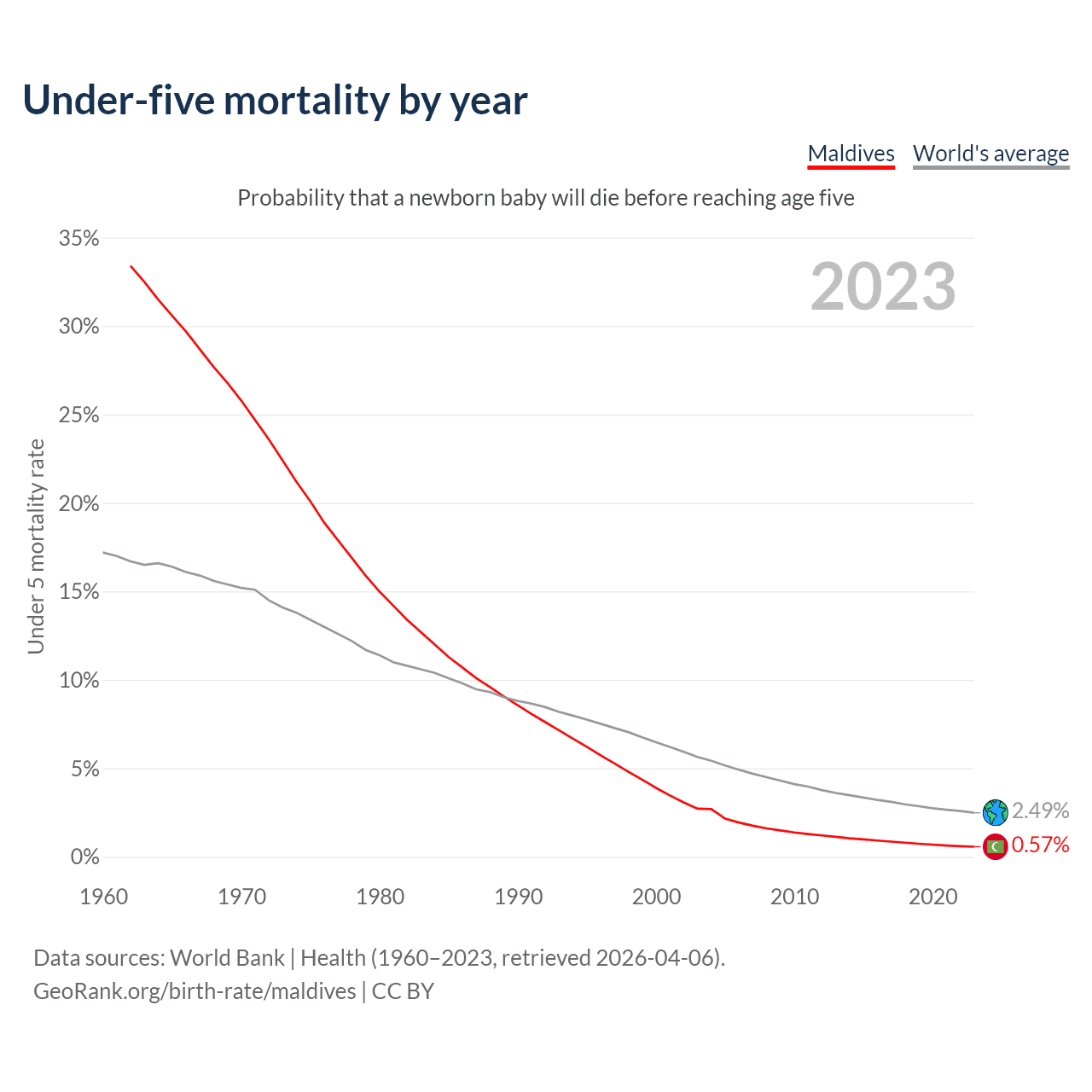 The under-5 mortality rate in Maldives was 5.7 deaths per 1,000 live births in 2023 — a 0.57% chance that a newborn baby will die before reaching age five. This is down from 39 deaths per 1,000 live births in 2000.