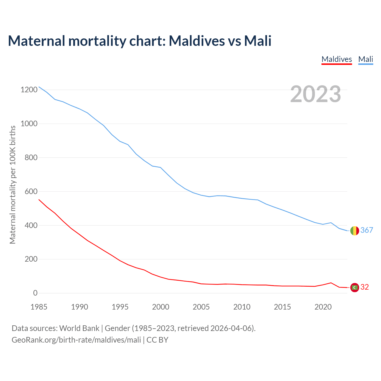 Maldives has an annual birth rate of 11 births per 1,000 people, compared to 40 for Mali. The average number of children a woman is expected to have during her lifetime — the fertility rate, is 1.58 in Maldives and 5.61 in Mali — 256.4% difference.