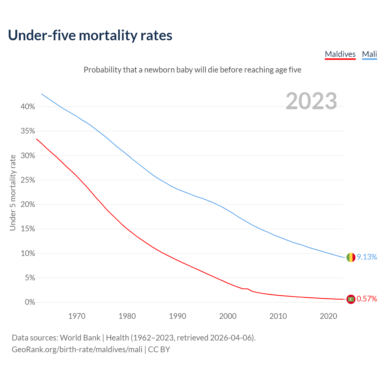 The chance that a newborn baby will die before reaching age five is 0.57% in Maldives and 9.13% in Mali. Above is a chart with historical data on under-five mortality rates.