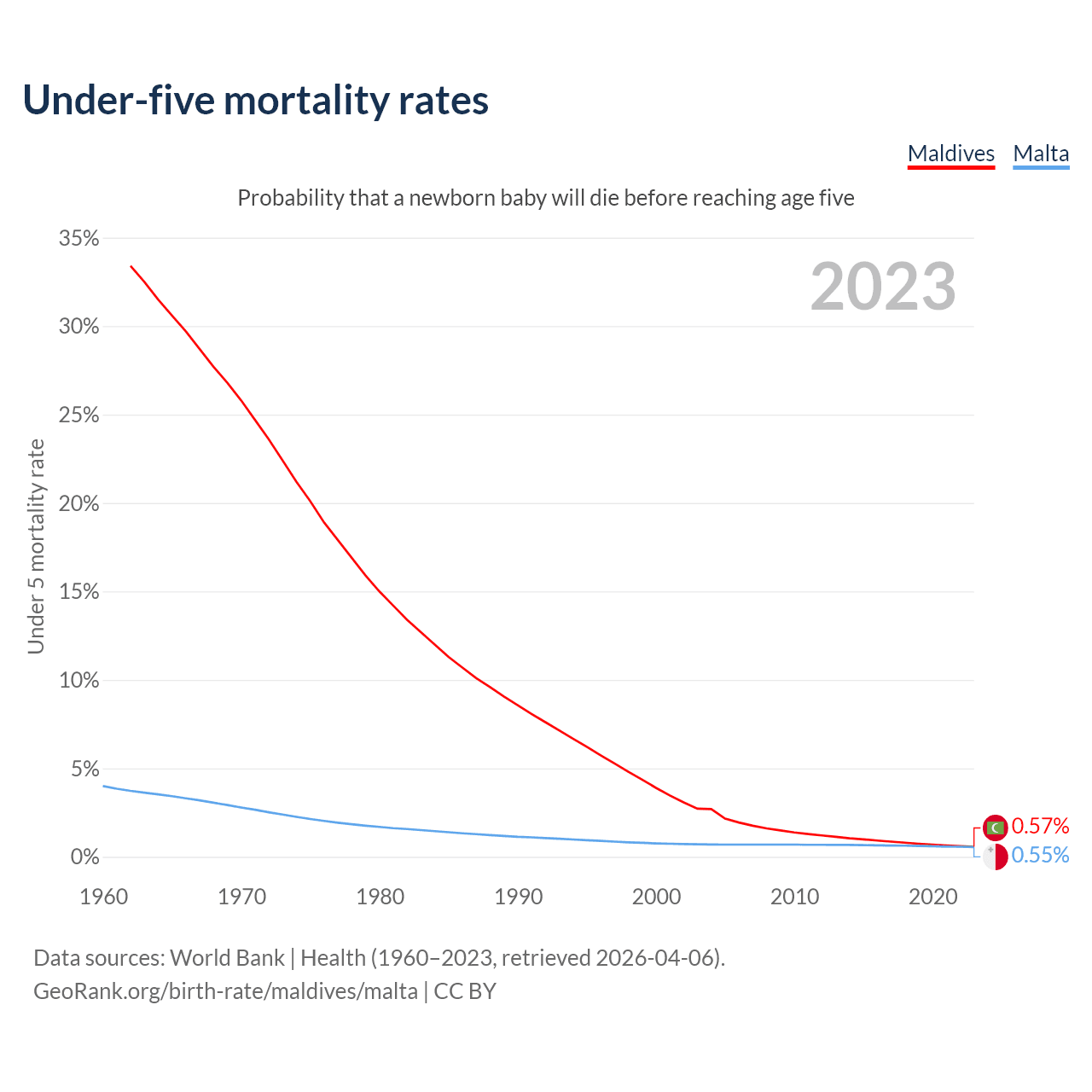 The chance that a newborn baby will die before reaching age five is 0.57% in Maldives and 0.55% in Malta. Above is a chart with historical data on under-five mortality rates.