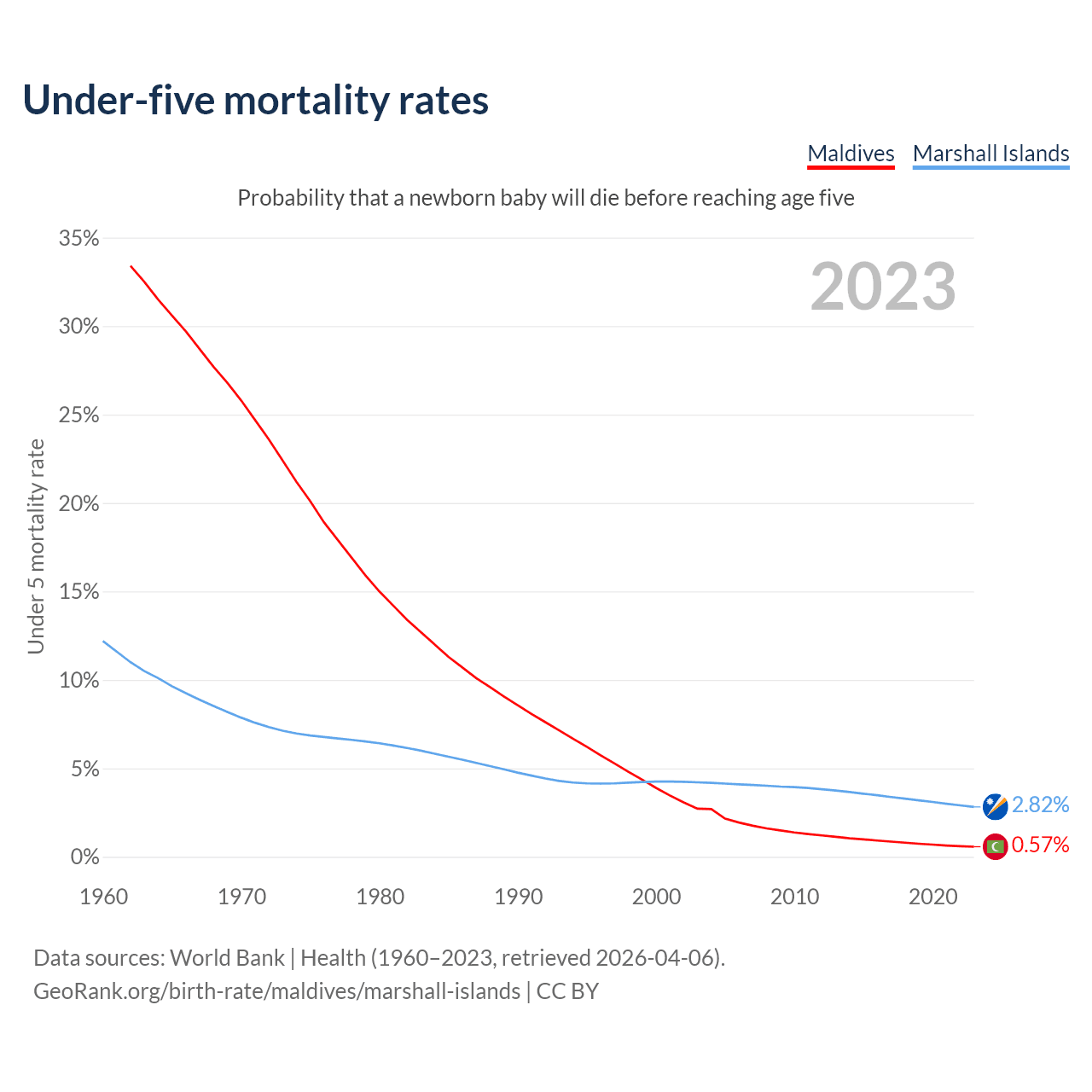The chance that a newborn baby will die before reaching age five is 0.57% in Maldives and 2.82% in the Marshall Islands. Above is a chart with historical data on under-five mortality rates.