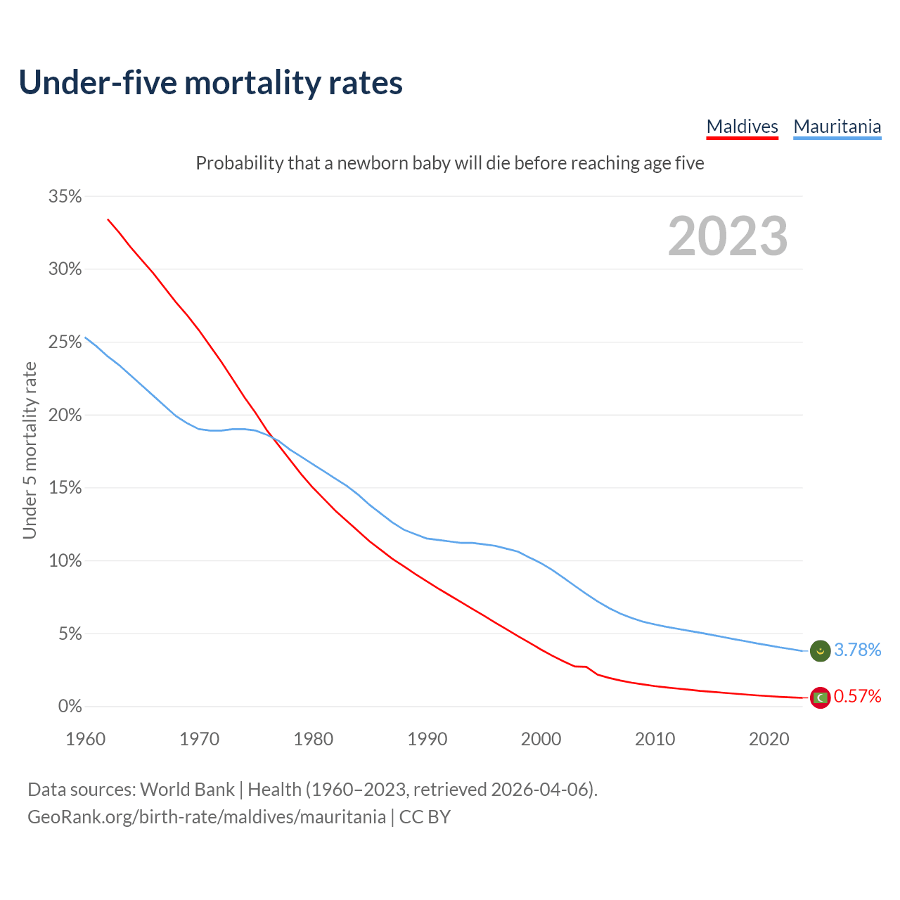 The chance that a newborn baby will die before reaching age five is 0.57% in Maldives and 3.78% in Mauritania. Above is a chart with historical data on under-five mortality rates.