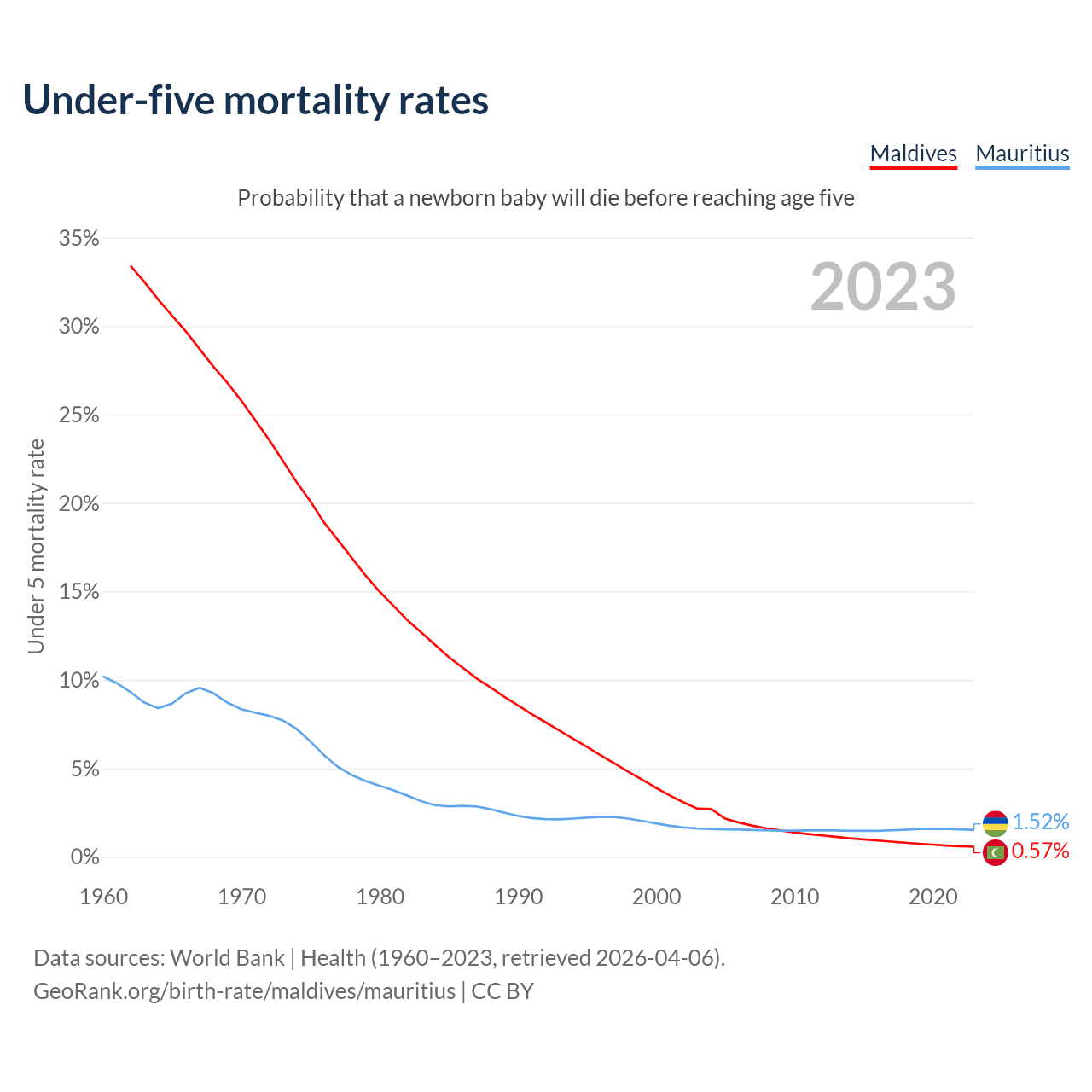 The chance that a newborn baby will die before reaching age five is 0.57% in Maldives and 1.52% in Mauritius. Above is a chart with historical data on under-five mortality rates.