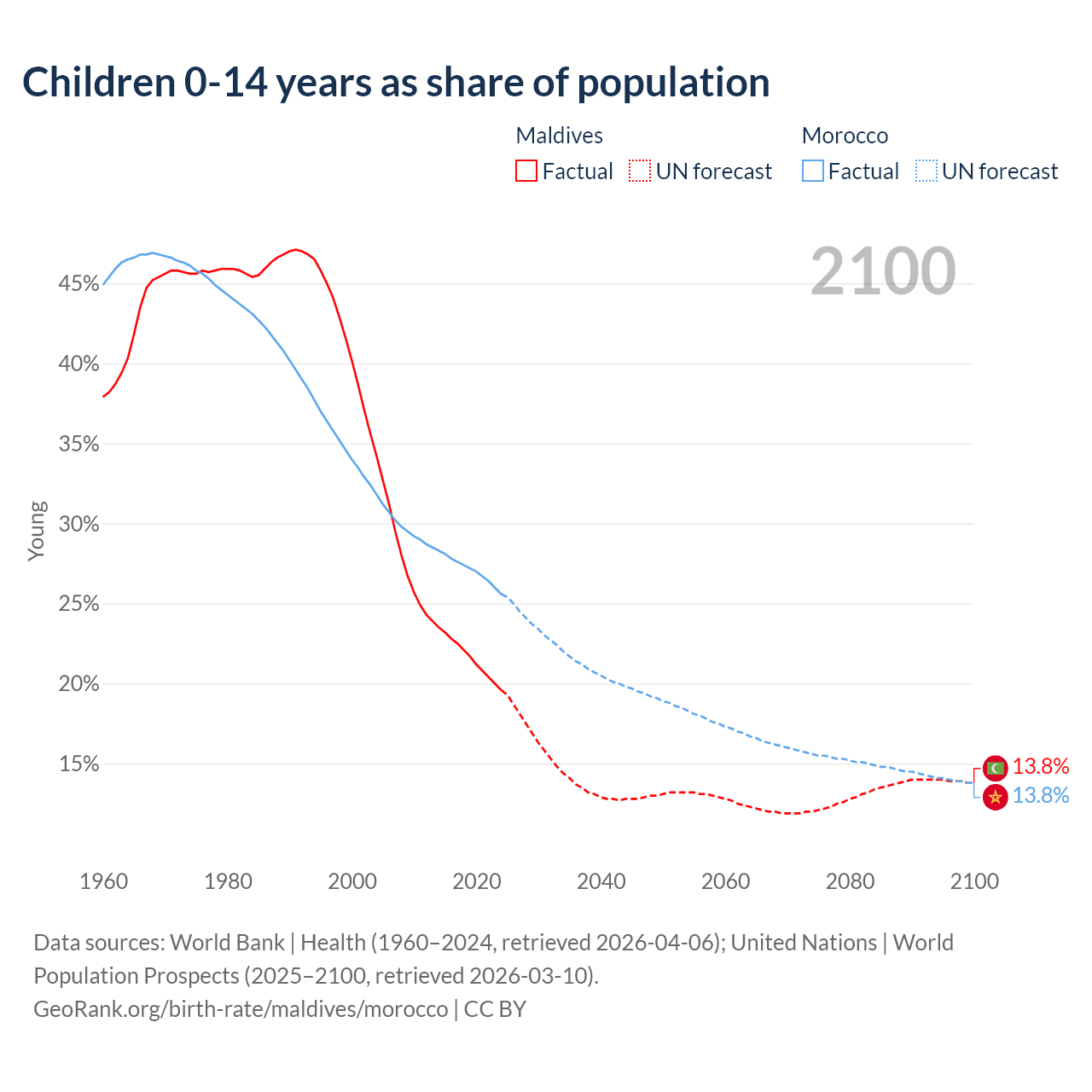 According to the latest available data on birth rates, the fertility rate in Maldives was 1.58 children per woman in 2023, compared to 2.23 in Morocco in 2023. The replacement level is considered to be 2.1 children per woman.