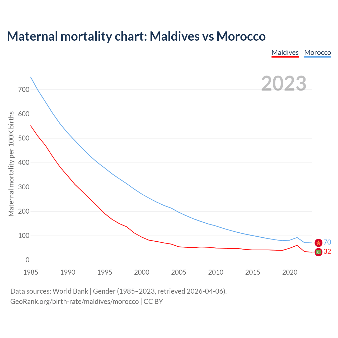 The maternal mortality rate, which is the probability of dying during childbirth or within 42 days of pregnancy termination, is 32 deaths per 100,000 live births in Maldives, compared to 70 deaths in Morocco.