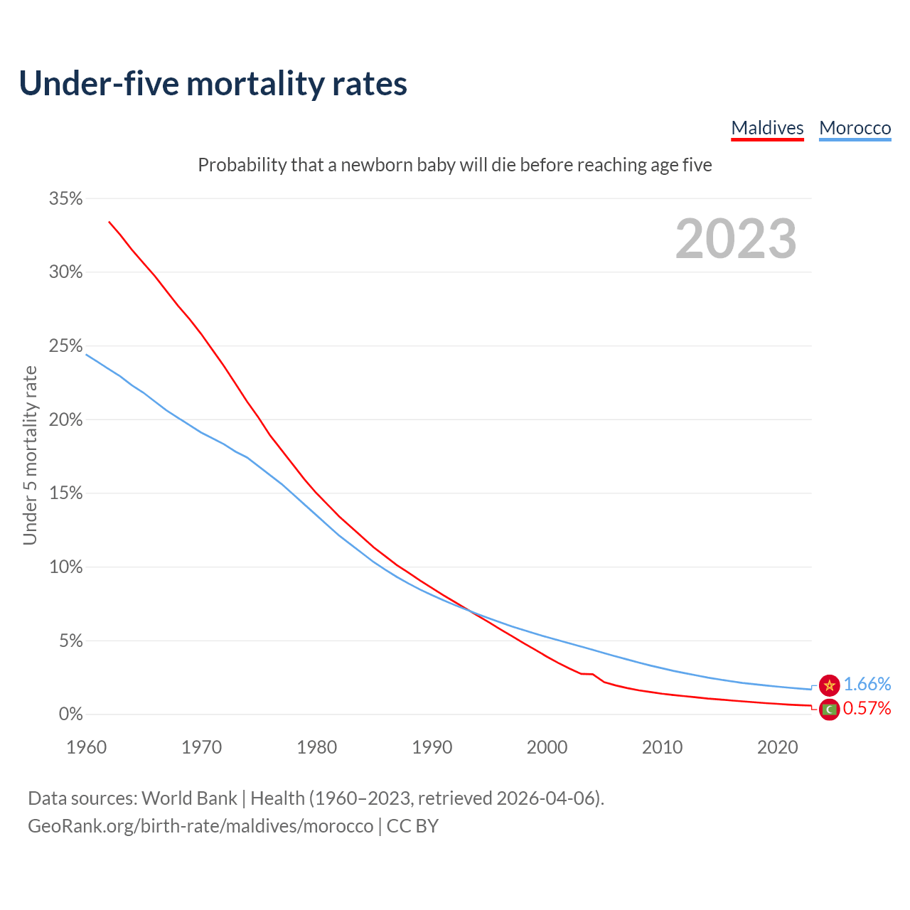 The chance that a newborn baby will die before reaching age five is 0.57% in Maldives and 1.66% in Morocco. Above is a chart with historical data on under-five mortality rates.