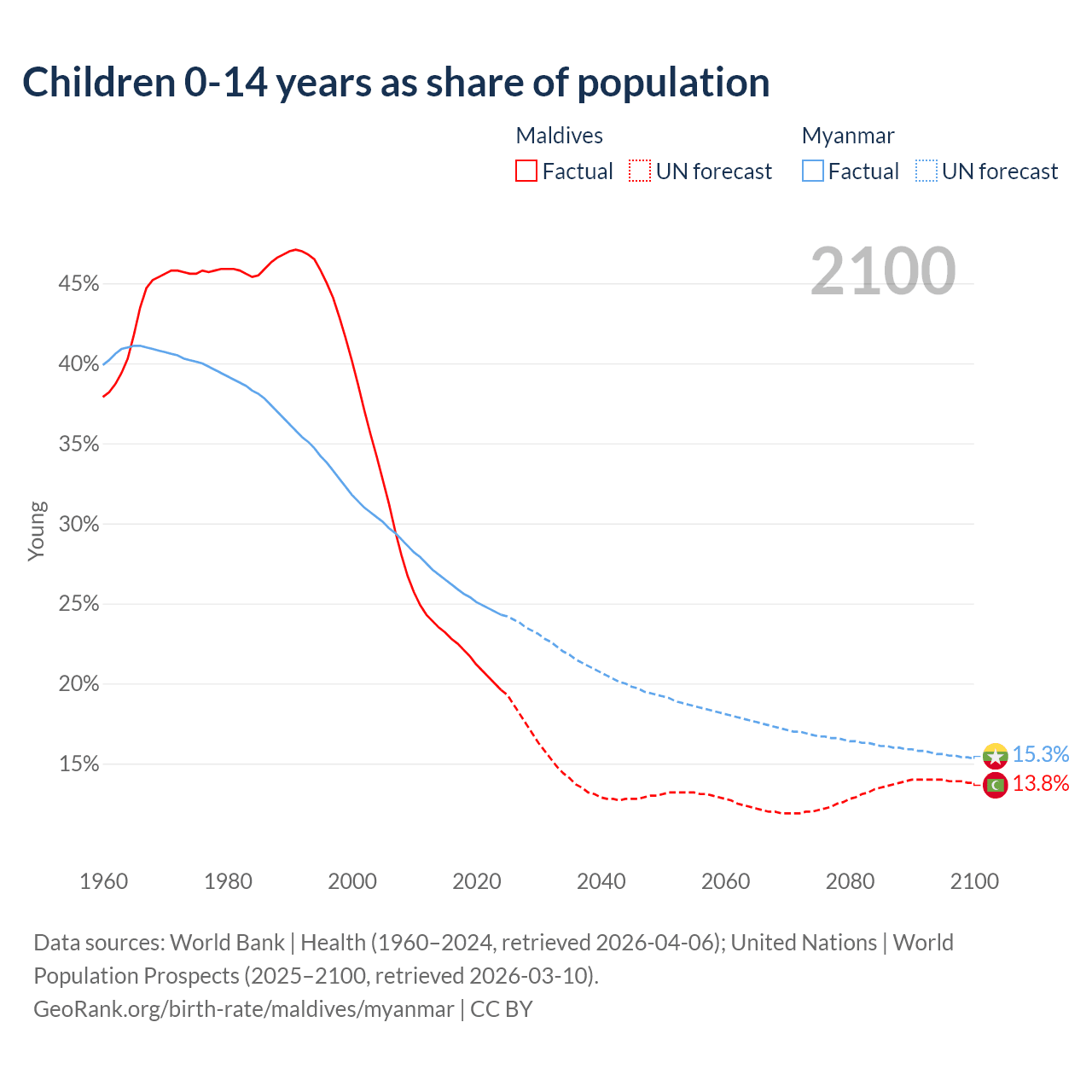 According to the latest available data on birth rates, the fertility rate in Maldives was 1.58 children per woman in 2023, compared to 2.12 in Myanmar in 2023. The replacement level is considered to be 2.1 children per woman.