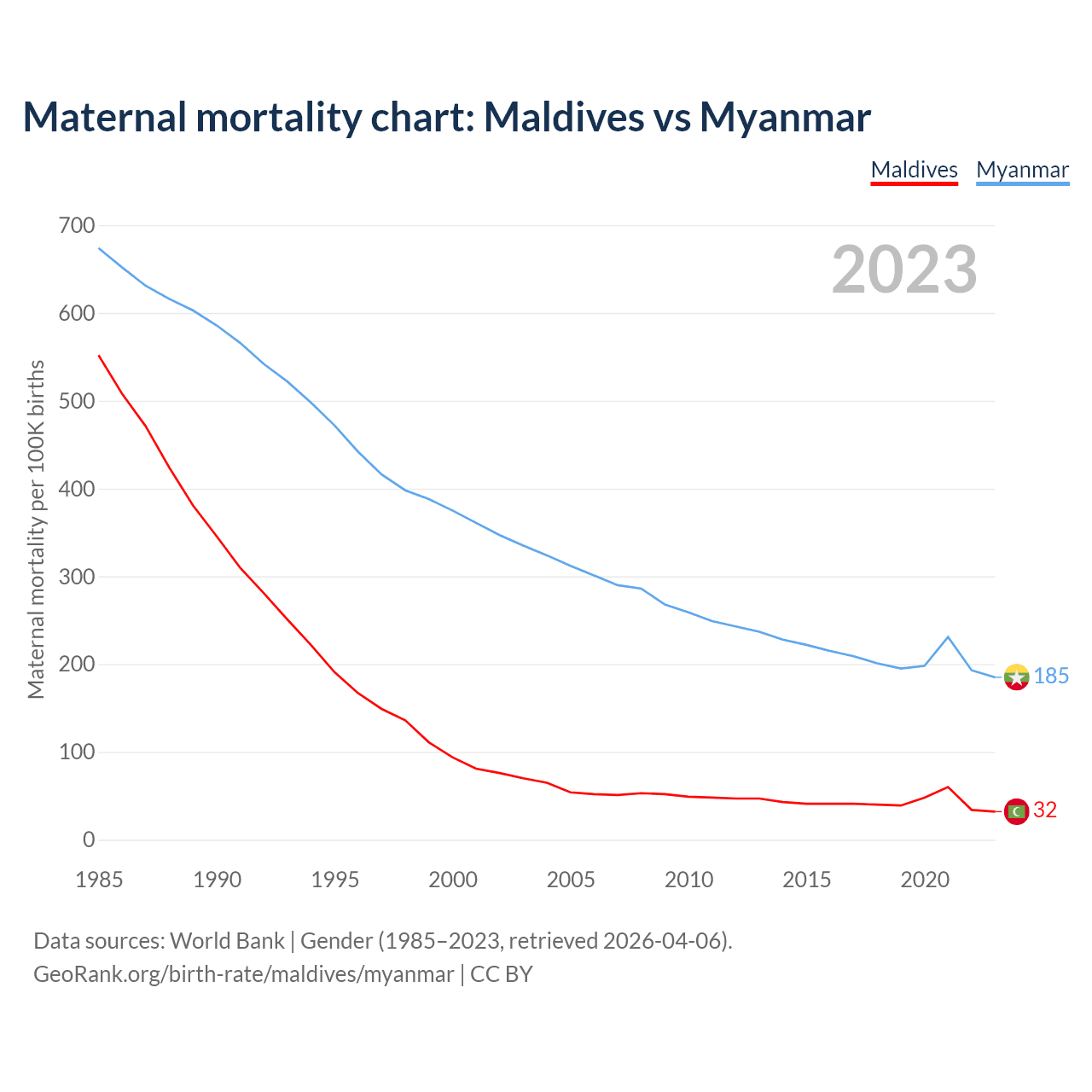 The maternal mortality rate, which is the probability of dying during childbirth or within 42 days of pregnancy termination, is 32 deaths per 100,000 live births in Maldives, compared to 185 deaths in Myanmar.