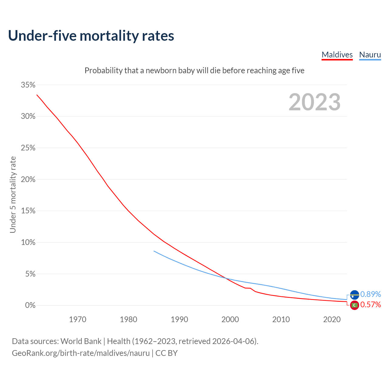 The chance that a newborn baby will die before reaching age five is 0.57% in Maldives and 0.89% in Nauru. Above is a chart with historical data on under-five mortality rates.