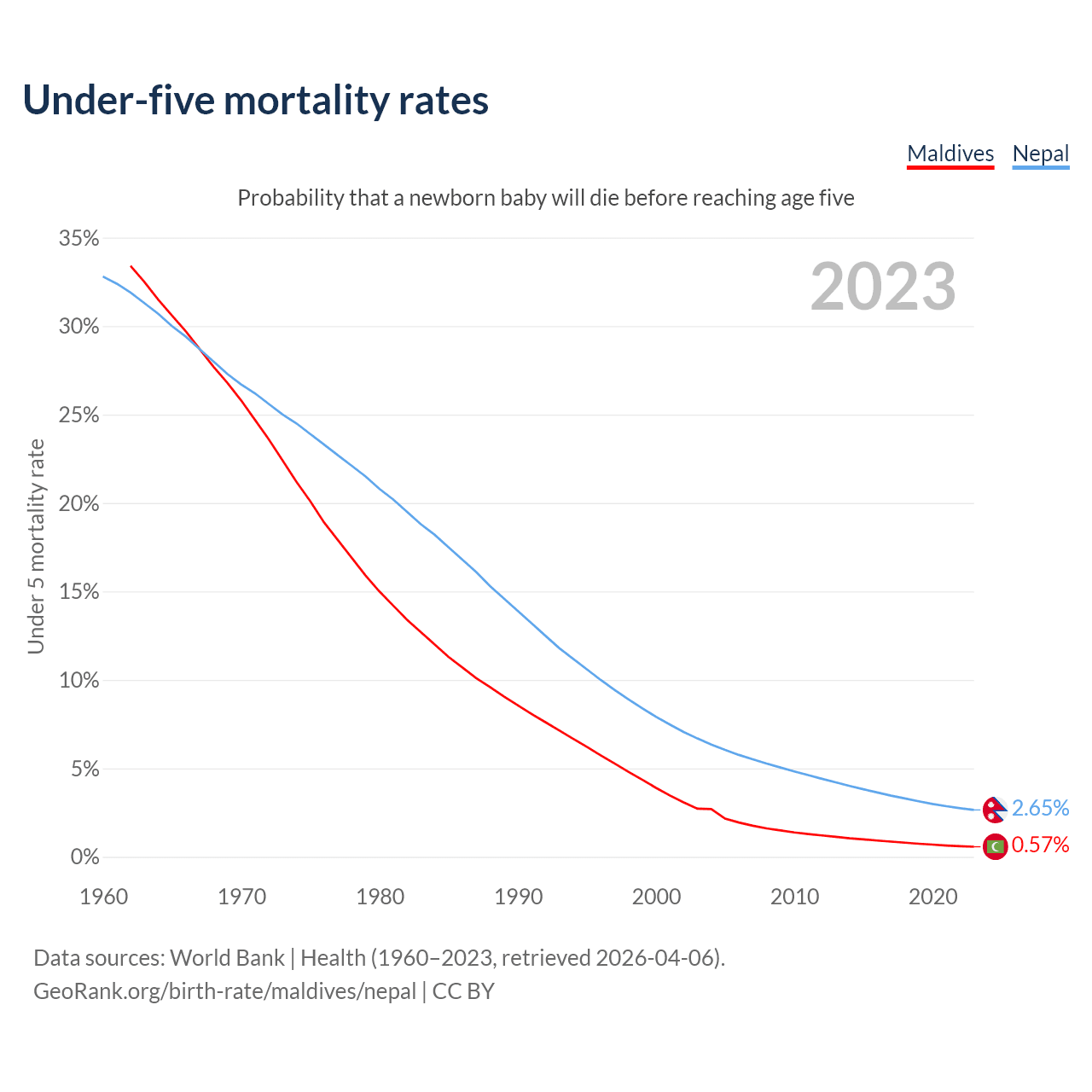 The chance that a newborn baby will die before reaching age five is 0.57% in Maldives and 2.65% in Nepal. Above is a chart with historical data on under-five mortality rates.