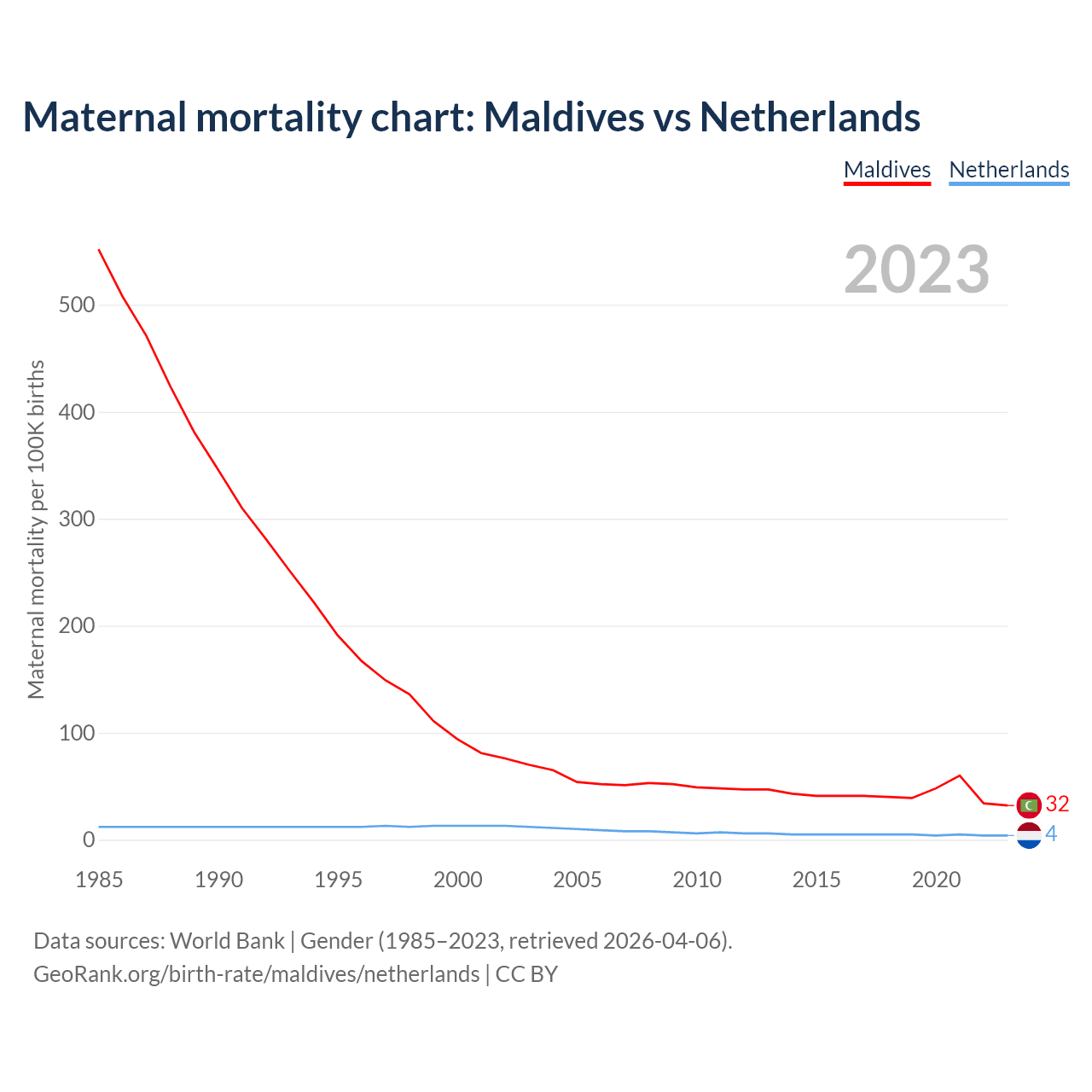 The maternal mortality rate, which is the probability of dying during childbirth or within 42 days of pregnancy termination, is 32 deaths per 100,000 live births in Maldives, compared to 4 deaths in the Netherlands.