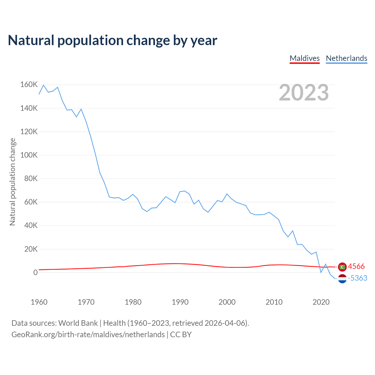 According to the latest available data on birth rates, the fertility rate in Maldives was 1.58 children per woman in 2023, compared to 1.43 in the Netherlands in 2023. The replacement level is considered to be 2.1 children per woman.