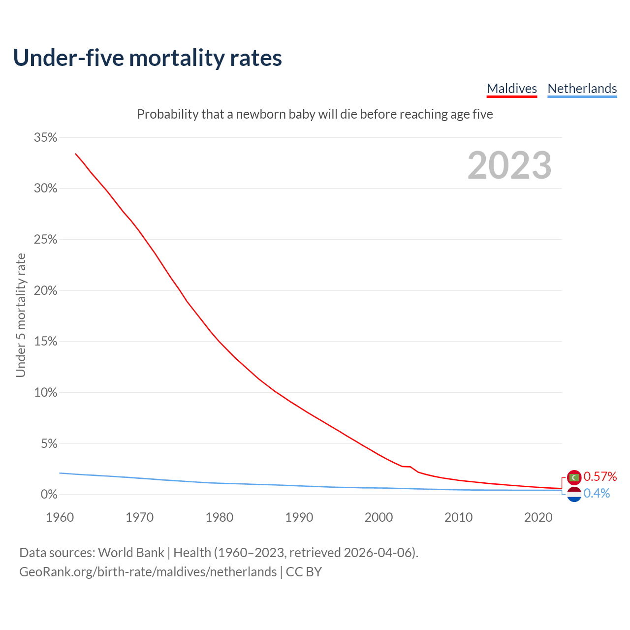 The chance that a newborn baby will die before reaching age five is 0.57% in Maldives and 0.4% in the Netherlands. Above is a chart with historical data on under-five mortality rates.