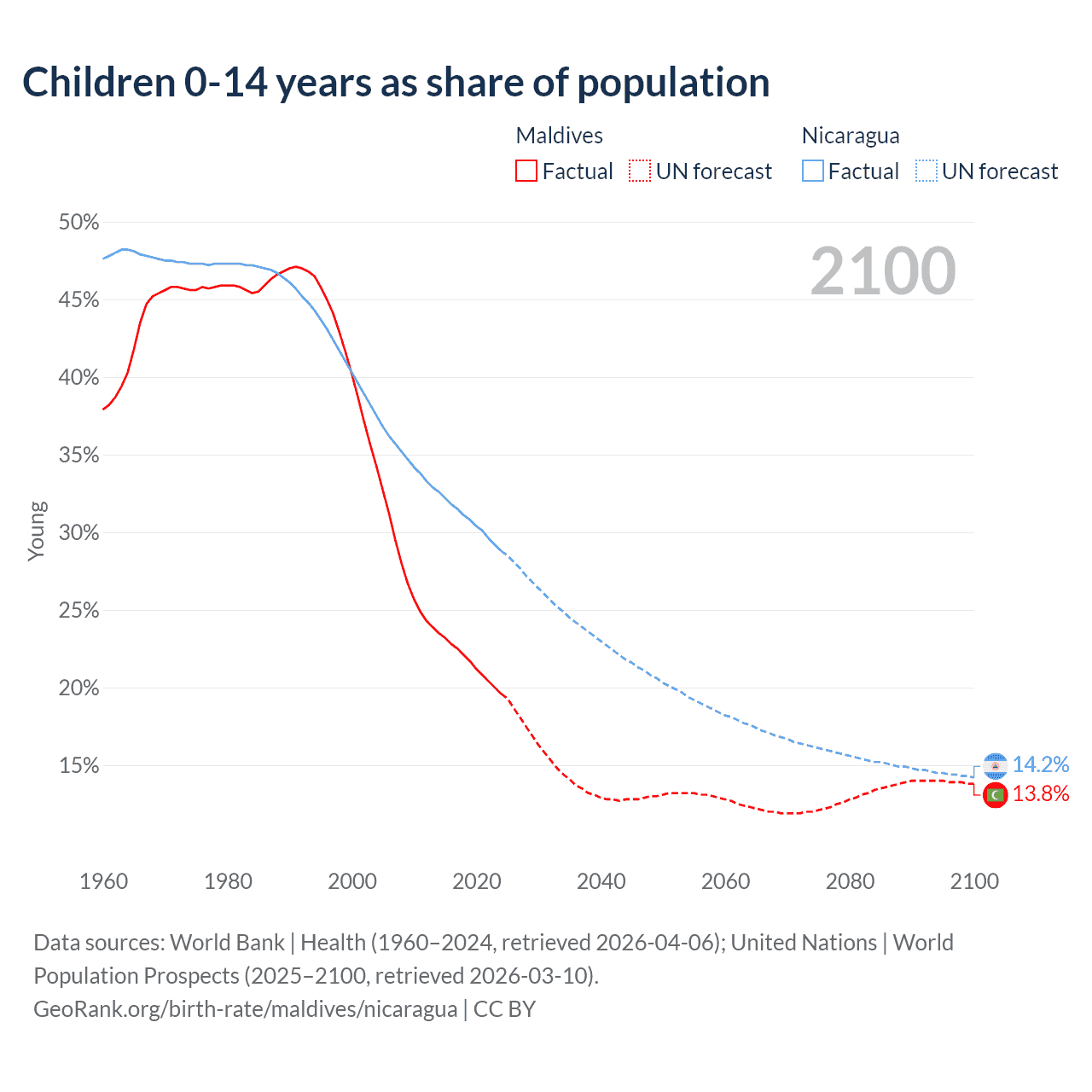 According to the latest available data on birth rates, the fertility rate in Maldives was 1.58 children per woman in 2023, compared to 2.22 in Nicaragua in 2023. The replacement level is considered to be 2.1 children per woman.