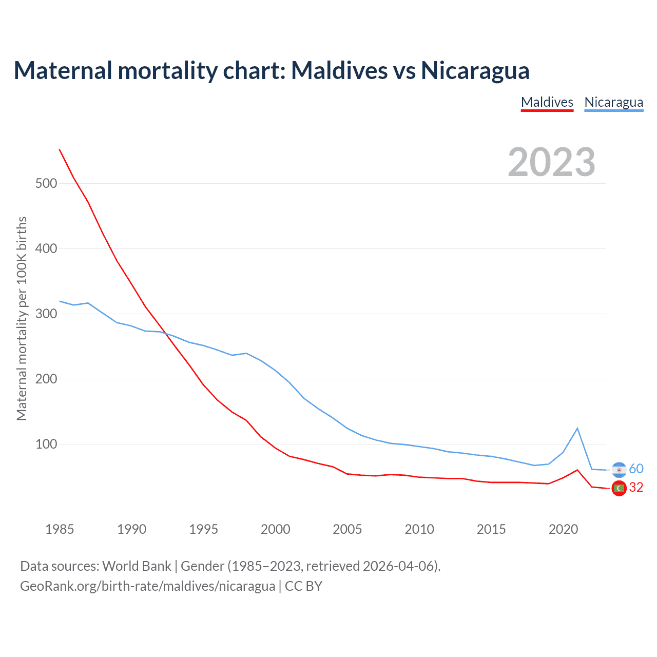 The maternal mortality rate, which is the probability of dying during childbirth or within 42 days of pregnancy termination, is 32 deaths per 100,000 live births in Maldives, compared to 60 deaths in Nicaragua.