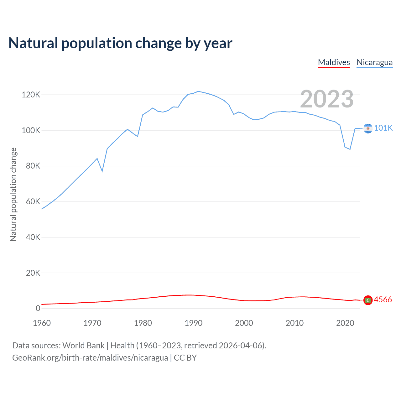 Maldives has an annual birth rate of 11 births per 1,000 people, compared to 19.4 for Nicaragua. The average number of children a woman is expected to have during her lifetime — the fertility rate, is 1.58 in Maldives and 2.22 in Nicaragua — 40.8% difference.