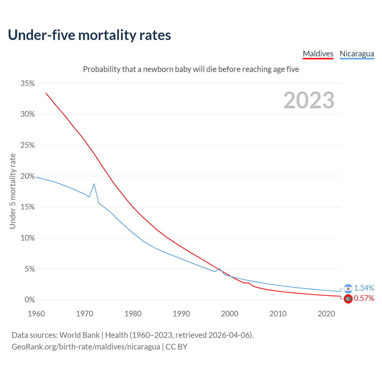 The chance that a newborn baby will die before reaching age five is 0.57% in Maldives and 1.34% in Nicaragua. Above is a chart with historical data on under-five mortality rates.