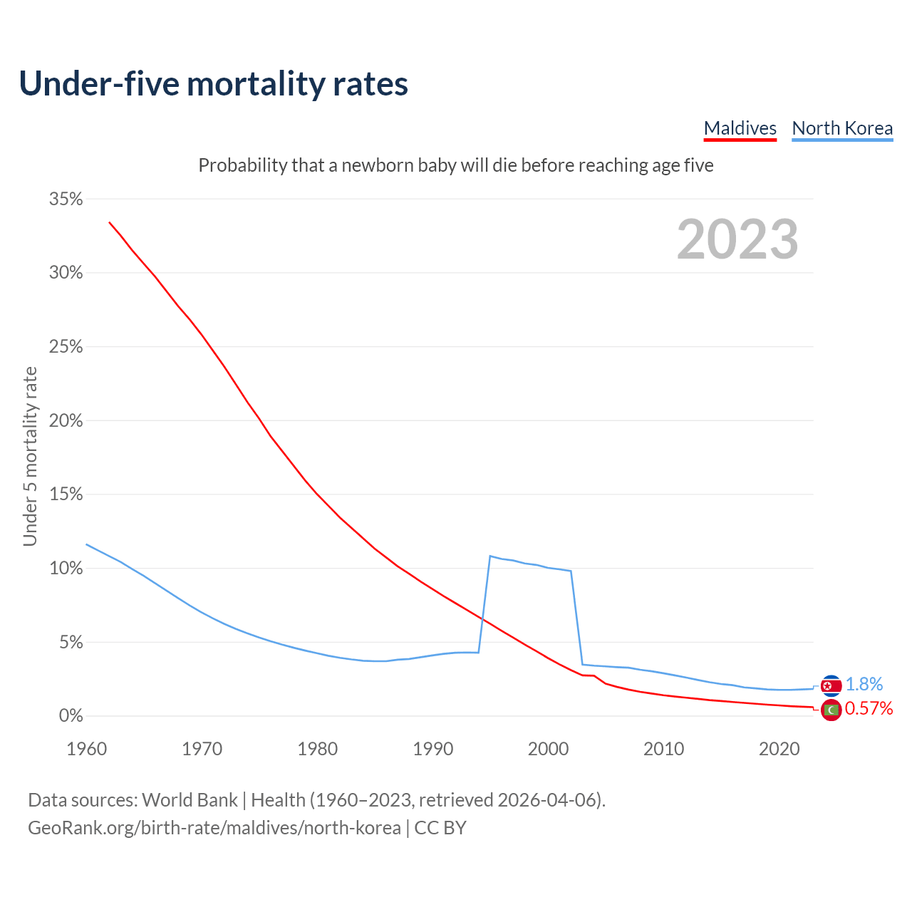 The chance that a newborn baby will die before reaching age five is 0.57% in Maldives and 1.8% in North Korea. Above is a chart with historical data on under-five mortality rates.